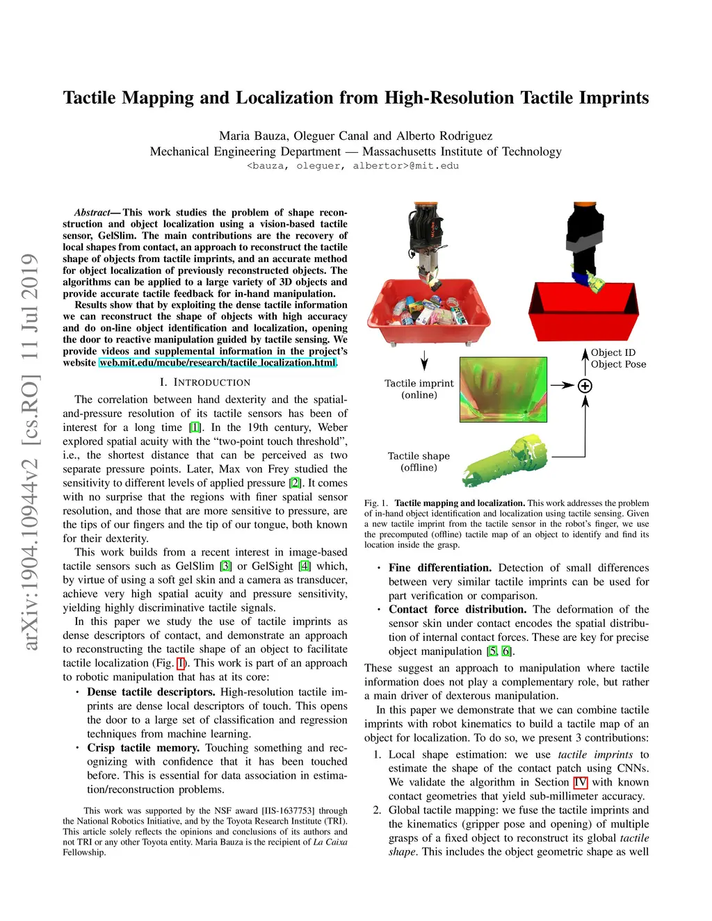 This work studies the problem of shape reconstruction and object localization using a vision-based tactile sensor, GelSlim. The main contributions are the recovery of local shapes from contact, an approach to reconstruct the tactile shape of objects from tactile imprints, and an accurate method for object localization of previously reconstructed objects. The algorithms can be applied to a large variety of 3D objects and provide accurate tactile feedback for in-hand manipulation. Results show that by exploiting the dense tactile information we can reconstruct the shape of objects with high accuracy and do on-line object identification and localization, opening the door to reactive manipulation guided by tactile sensing. We provide videos and supplemental information in the project's website http://web.mit.edu/mcube/research/tactile_localization.html.