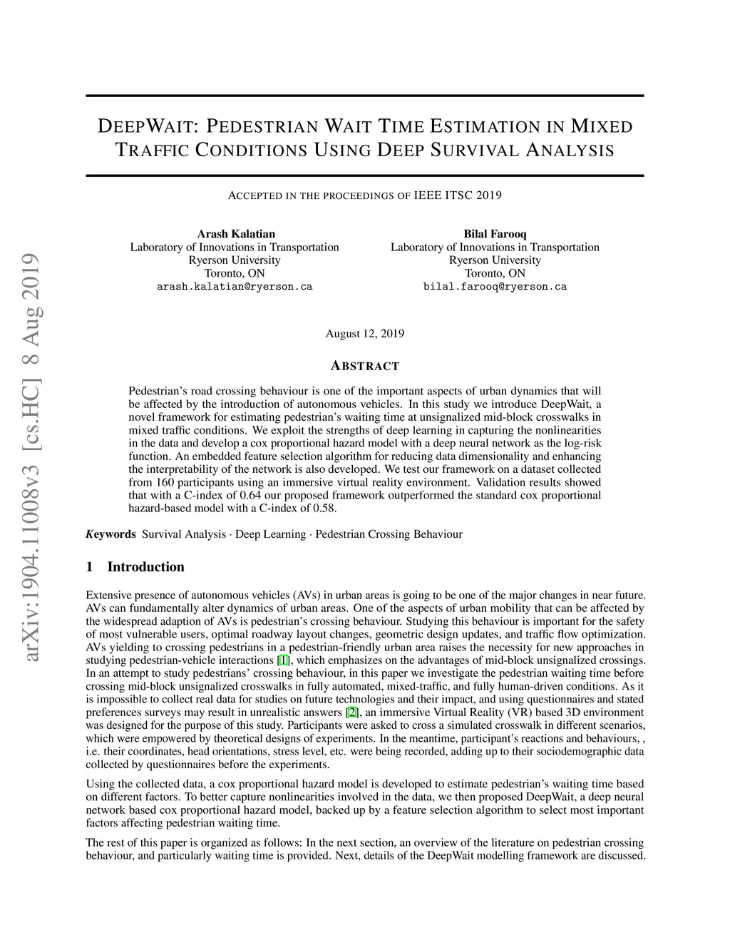 DeepWait: Pedestrian Wait Time Estimation in Mixed Traffic Conditions Using Deep Survival Analysis