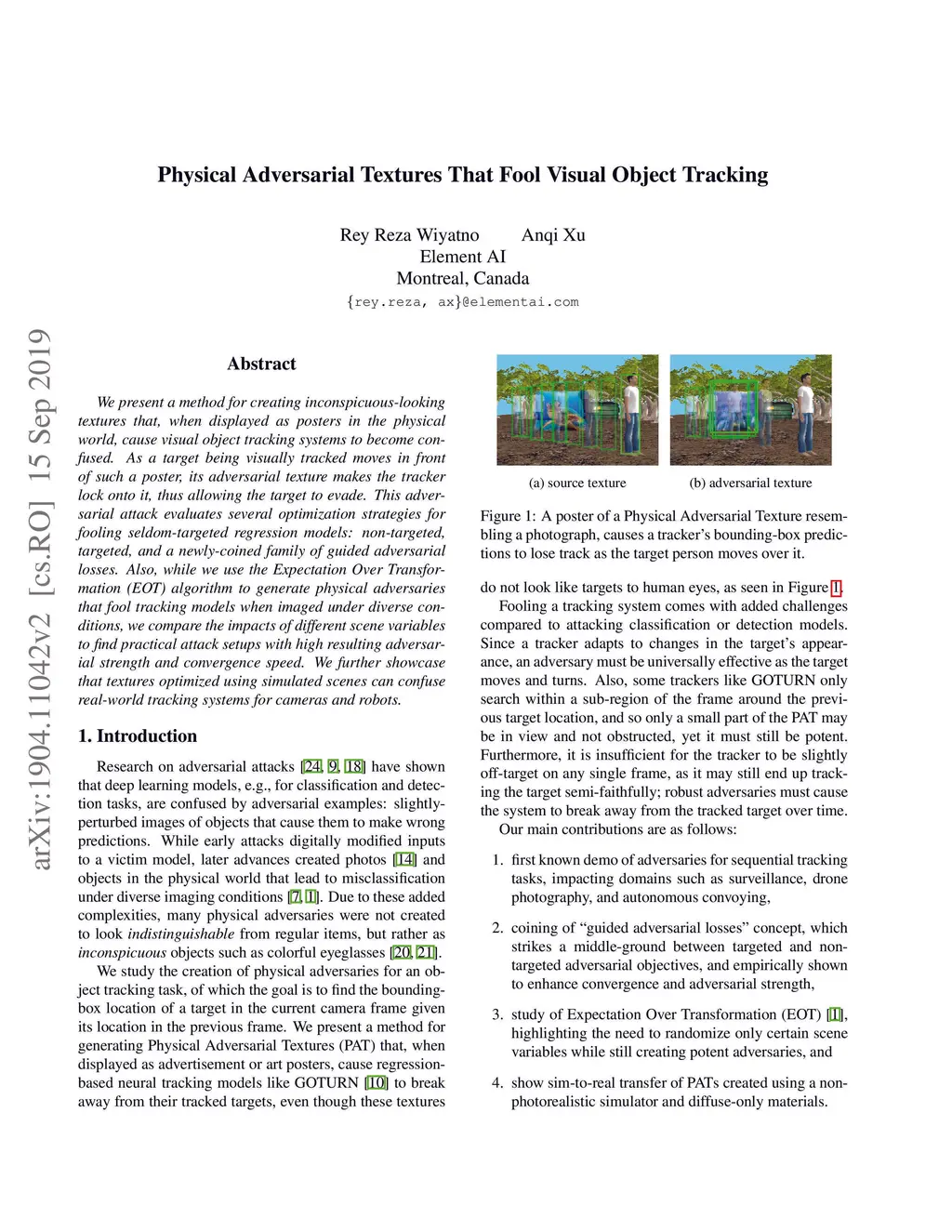 We present a system for generating inconspicuous-looking textures that, when displayed in the physical world as digital or printed posters, cause visual object tracking systems to become confused. For instance, as a target being tracked by a robot's camera moves in front of such a poster, our generated texture makes the tracker lock onto it and allows the target to evade. This work aims to fool seldom-targeted regression tasks, and in particular compares diverse optimization strategies: non-targeted, targeted, and a new family of guided adversarial losses. While we use the Expectation Over Transformation (EOT) algorithm to generate physical adversaries that fool tracking models when imaged under diverse conditions, we compare the impacts of different conditioning variables, including viewpoint, lighting, and appearances, to find practical attack setups with high resulting adversarial strength and convergence speed. We further showcase textures optimized solely using simulated scenes can confuse real-world tracking systems.