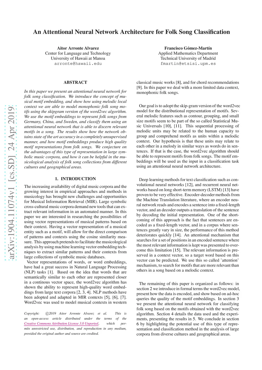In this paper we present an attentional neural network for folk song classification. We introduce the concept of musical motif embedding, and show how using melodic local context we are able to model monophonic folk song motifs using the skipgram version of the word2vec algorithm. We use the motif embeddings to represent folk songs from Germany, China, and Sweden, and classify them using an attentional neural network that is able to discern relevant motifs in a song. The results show how the network obtains state of the art accuracy in a completely unsupervised manner, and how motif embeddings produce high quality motif representations from folk songs. We conjecture on the advantages of this type of representation in large symbolic music corpora, and how it can be helpful in the musicological analysis of folk song collections from different cultures and geographical areas.