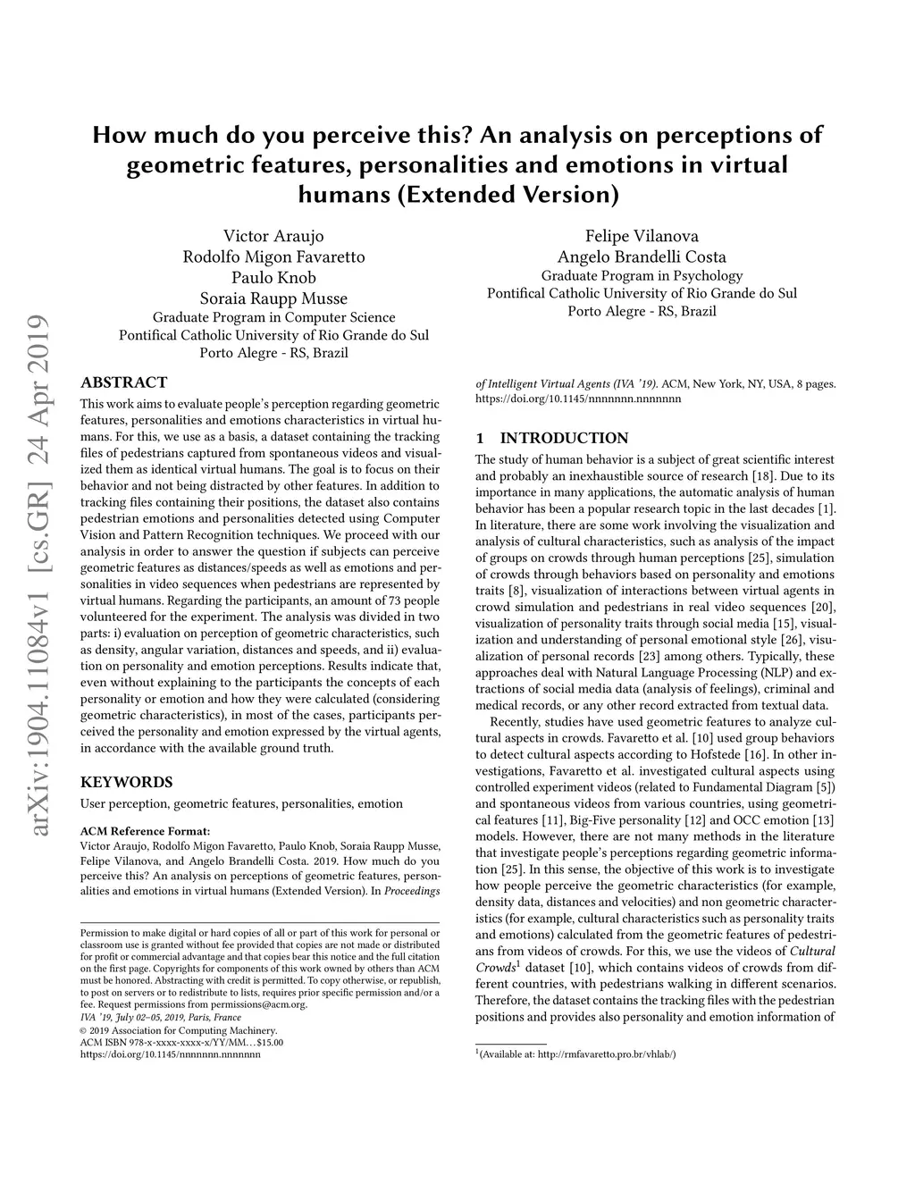 This work aims to evaluate people's perception regarding geometric features, personalities and emotions characteristics in virtual humans. For this, we use as a basis, a dataset containing the tracking files of pedestrians captured from spontaneous videos and visualized them as identical virtual humans. The goal is to focus on their behavior and not being distracted by other features. In addition to tracking files containing their positions, the dataset also contains pedestrian emotions and personalities detected using Computer Vision and Pattern Recognition techniques. We proceed with our analysis in order to answer the question if subjects can perceive geometric features as distances/speeds as well as emotions and personalities in video sequences when pedestrians are represented by virtual humans. Regarding the participants, an amount of 73 people volunteered for the experiment. The analysis was divided in two parts: i) evaluation on perception of geometric characteristics, such as density, angular variation, distances and speeds, and ii) evaluation on personality and emotion perceptions. Results indicate that, even without explaining to the participants the concepts of each personality or emotion and how they were calculated (considering geometric characteristics), in most of the cases, participants perceived the personality and emotion expressed by the virtual agents, in accordance with the available ground truth.