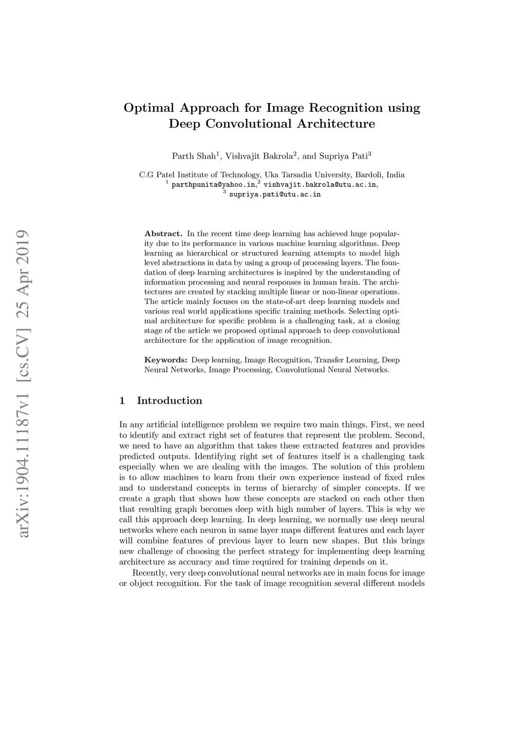 In the recent time deep learning has achieved huge popularity due to its performance in various machine learning algorithms. Deep learning as hierarchical or structured learning attempts to model high level abstractions in data by using a group of processing layers. The foundation of deep learning architectures is inspired by the understanding of information processing and neural responses in human brain. The architectures are created by stacking multiple linear or non-linear operations. The article mainly focuses on the state-of-art deep learning models and various real world applications specific training methods. Selecting optimal architecture for specific problem is a challenging task, at a closing stage of the article we proposed optimal approach to deep convolutional architecture for the application of image recognition.