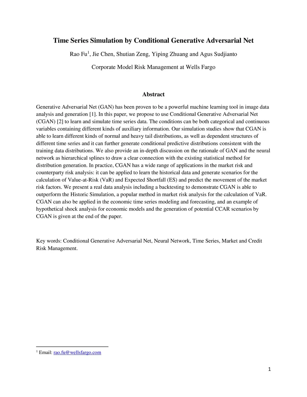 Generative Adversarial Net (GAN) has been proven to be a powerful machine learning tool in image data analysis and generation. In this paper, we propose to use Conditional Generative Adversarial Net (CGAN) to learn and simulate time series data. The conditions can be both categorical and continuous variables containing different kinds of auxiliary information. Our simulation studies show that CGAN is able to learn different kinds of normal and heavy tail distributions, as well as dependent structures of different time series and it can further generate conditional predictive distributions consistent with the training data distributions. We also provide an in-depth discussion on the rationale of GAN and the neural network as hierarchical splines to draw a clear connection with the existing statistical method for distribution generation. In practice, CGAN has a wide range of applications in the market risk and counterparty risk analysis: it can be applied to learn the historical data and generate scenarios for the calculation of Value-at-Risk (VaR) and Expected Shortfall (ES) and predict the movement of the market risk factors. We present a real data analysis including a backtesting to demonstrate CGAN is able to outperform the Historic Simulation, a popular method in market risk analysis for the calculation of VaR. CGAN can also be applied in the economic time series modeling and forecasting, and an example of hypothetical shock analysis for economic models and the generation of potential CCAR scenarios by CGAN is given at the end of the paper.