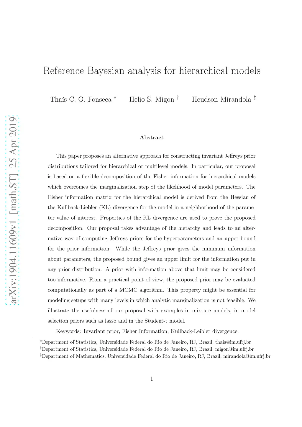 This paper proposes an alternative approach for constructing invariant Jeffreys prior distributions tailored for hierarchical or multilevel models. In particular, our proposal is based on a flexible decomposition of the Fisher information for hierarchical models which overcomes the marginalization step of the likelihood of model parameters. The Fisher information matrix for the hierarchical model is derived from the Hessian of the Kullback-Liebler (KL) divergence for the model in a neighborhood of the parameter value of interest. Properties of the KL divergence are used to prove the proposed decomposition. Our proposal takes advantage of the hierarchy and leads to an alternative way of computing Jeffreys priors for the hyperparameters and an upper bound for the prior information. While the Jeffreys prior gives the minimum information about parameters, the proposed bound gives an upper limit for the information put in any prior distribution. A prior with information above that limit may be considered too informative. From a practical point of view, the proposed prior may be evaluated computationally as part of a MCMC algorithm. This property might be essential for modeling setups with many levels in which analytic marginalization is not feasible. We illustrate the usefulness of our proposal with examples in mixture models, in model selection priors such as lasso and in the Student-t model.