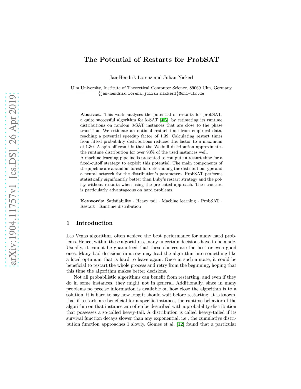 This work analyses the potential of restarts for probSAT, a quite successful algorithm for k-SAT, by estimating its runtime distributions on random 3-SAT instances that are close to the phase transition. We estimate an optimal restart time from empirical data, reaching a potential speedup factor of 1.39. Calculating restart times from fitted probability distributions reduces this factor to a maximum of 1.30. A spin-off result is that the Weibull distribution approximates the runtime distribution for over 93% of the used instances well. A machine learning pipeline is presented to compute a restart time for a fixed-cutoff strategy to exploit this potential. The main components of the pipeline are a random forest for determining the distribution type and a neural network for the distribution's parameters. ProbSAT performs statistically significantly better than Luby's restart strategy and the policy without restarts when using the presented approach. The structure is particularly advantageous on hard problems.