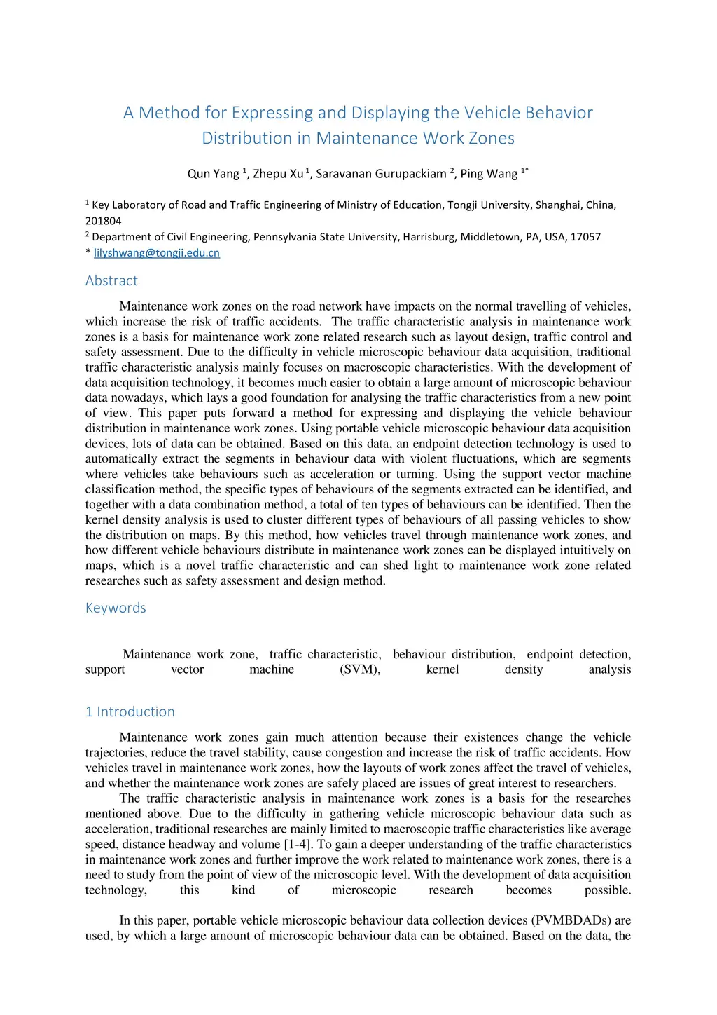 Maintenance work zones on the road network have impacts on the normal travelling of vehicles, which increase the risk of traffic accidents. The traffic characteristic analysis in maintenance work zones is a basis for maintenance work zone related research such as layout design, traffic control and safety assessment. Due to the difficulty in vehicle microscopic behaviour data acquisition, traditional traffic characteristic analysis mainly focuses on macroscopic characteristics. With the development of data acquisition technology, it becomes much easier to obtain a large amount of microscopic behaviour data nowadays, which lays a good foundation for analysing the traffic characteristics from a new point of view. This paper puts forward a method for expressing and displaying the vehicle behaviour distribution in maintenance work zones. Using portable vehicle microscopic behaviour data acquisition devices, lots of data can be obtained. Based on this data, an endpoint detection technology is used to automatically extract the segments in behaviour data with violent fluctuations, which are segments where vehicles take behaviours such as acceleration or turning. Using the support vector machine classification method, the specific types of behaviours of the segments extracted can be identified, and together with a data combination method, a total of ten types of behaviours can be identified. Then the kernel density analysis is used to cluster different types of behaviours of all passing vehicles to show the distribution on maps. By this method, how vehicles travel through maintenance work zones, and how different vehicle behaviours distribute in maintenance work zones can be displayed intuitively on maps, which is a novel traffic characteristic and can shed light to maintenance work zone related researches such as safety assessment and design method.