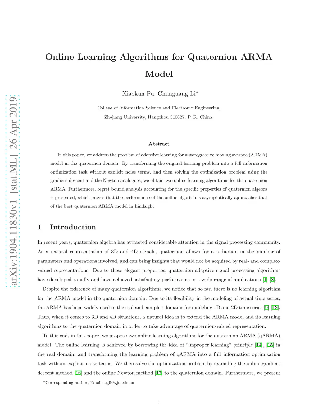 In this paper, we address the problem of adaptive learning for autoregressive moving average (ARMA) model in the quaternion domain. By transforming the original learning problem into a full information optimization task without explicit noise terms, and then solving the optimization problem using the gradient descent and the Newton analogues, we obtain two online learning algorithms for the quaternion ARMA. Furthermore, regret bound analysis accounting for the specific properties of quaternion algebra is presented, which proves that the performance of the online algorithms asymptotically approaches that of the best quaternion ARMA model in hindsight.