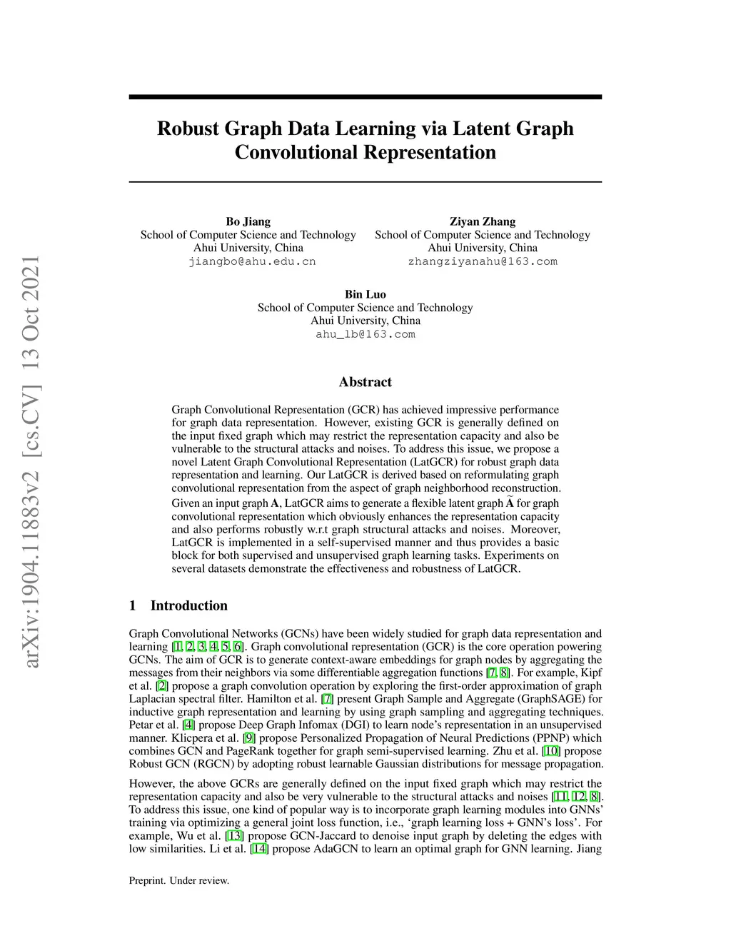 Graph Convolutional Representation (GCR) has achieved impressive performance for graph data representation. However, existing GCR is generally defined on the input fixed graph which may restrict the representation capacity and also be vulnerable to the structural attacks and noises. To address this issue, we propose a novel Latent Graph Convolutional Representation (LatGCR) for robust graph data representation and learning. Our LatGCR is derived based on reformulating graph convolutional representation from the aspect of graph neighborhood reconstruction. Given an input graph , LatGCR aims to generate a flexible latent graph for graph convolutional representation which obviously enhances the representation capacity and also performs robustly w.r.t graph structural attacks and noises. Moreover, LatGCR is implemented in a self-supervised manner and thus provides a basic block for both supervised and unsupervised graph learning tasks. Experiments on several datasets demonstrate the effectiveness and robustness of LatGCR.