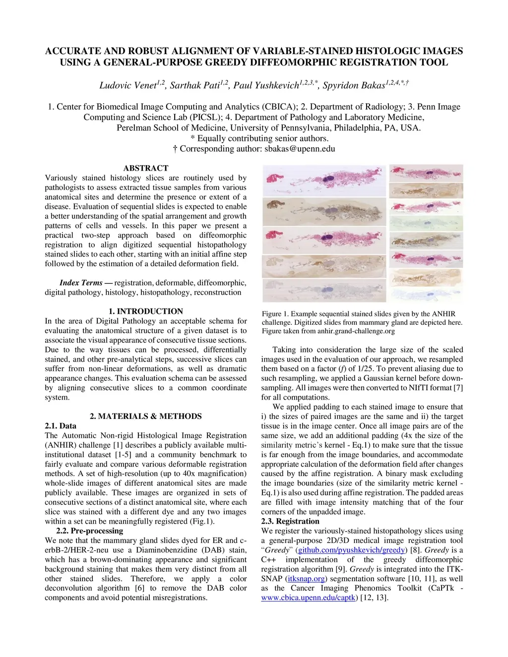 Variously stained histology slices are routinely used by pathologists to assess extracted tissue samples from various anatomical sites and determine the presence or extent of a disease. Evaluation of sequential slides is expected to enable a better understanding of the spatial arrangement and growth patterns of cells and vessels. In this paper we present a practical two-step approach based on diffeomorphic registration to align digitized sequential histopathology stained slides to each other, starting with an initial affine step followed by the estimation of a detailed deformation field.