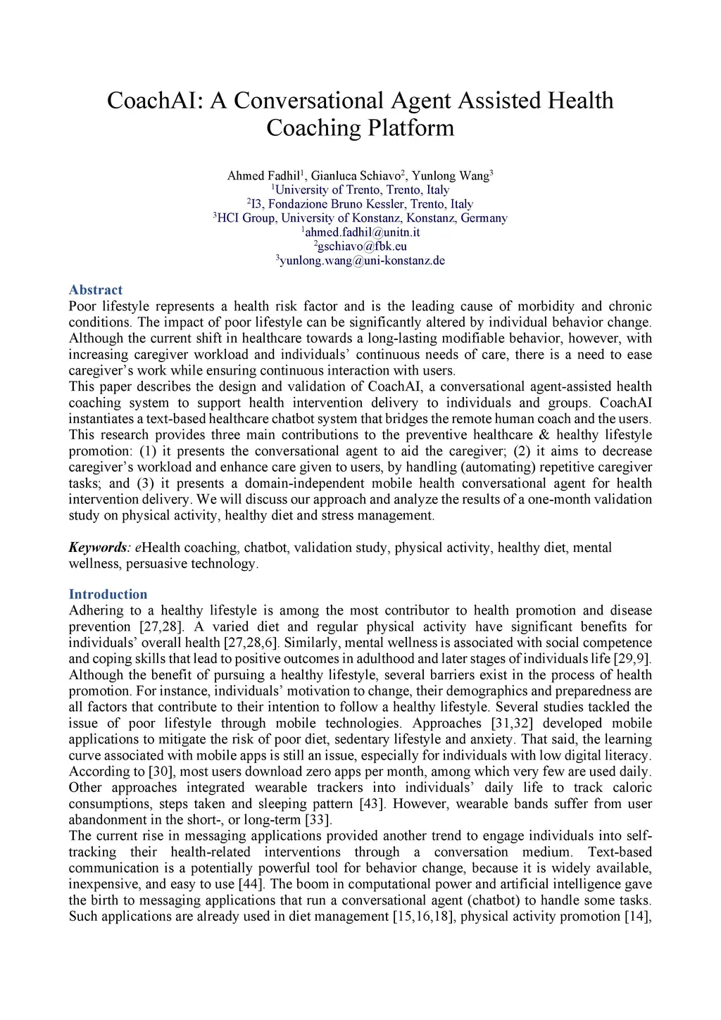 Poor lifestyle represents a health risk factor and is the leading cause of morbidity and chronic conditions. The impact of poor lifestyle can be significantly altered by individual behavior change. Although the current shift in healthcare towards a long lasting modifiable behavior, however, with increasing caregiver workload and individuals' continuous needs of care, there is a need to ease caregiver's work while ensuring continuous interaction with users. This paper describes the design and validation of CoachAI, a conversational agent assisted health coaching system to support health intervention delivery to individuals and groups. CoachAI instantiates a text based healthcare chatbot system that bridges the remote human coach and the users. This research provides three main contributions to the preventive healthcare and healthy lifestyle promotion: (1) it presents the conversational agent to aid the caregiver; (2) it aims to decrease caregiver's workload and enhance care given to users, by handling (automating) repetitive caregiver tasks; and (3) it presents a domain independent mobile health conversational agent for health intervention delivery. We will discuss our approach and analyze the results of a one month validation study on physical activity, healthy diet and stress management.