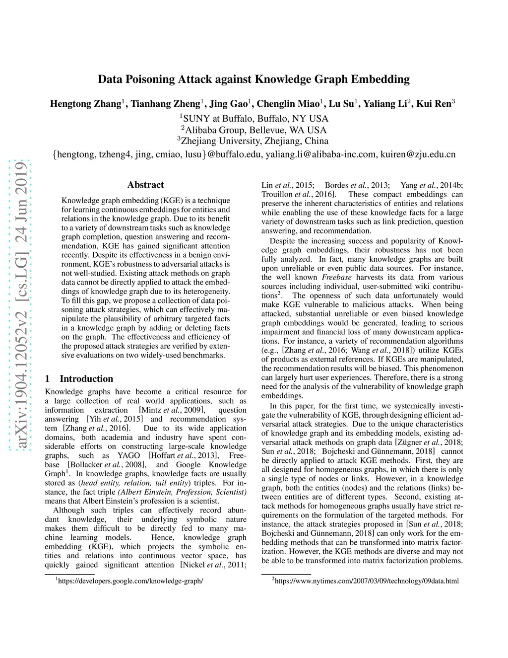 Knowledge graph embedding (KGE) is a technique for learning continuous embeddings for entities and relations in the knowledge graph.Due to its benefit to a variety of downstream tasks such as knowledge graph completion, question answering and recommendation, KGE has gained significant attention recently. Despite its effectiveness in a benign environment, KGE' robustness to adversarial attacks is not well-studied. Existing attack methods on graph data cannot be directly applied to attack the embeddings of knowledge graph due to its heterogeneity. To fill this gap, we propose a collection of data poisoning attack strategies, which can effectively manipulate the plausibility of arbitrary targeted facts in a knowledge graph by adding or deleting facts on the graph. The effectiveness and efficiency of the proposed attack strategies are verified by extensive evaluations on two widely-used benchmarks.