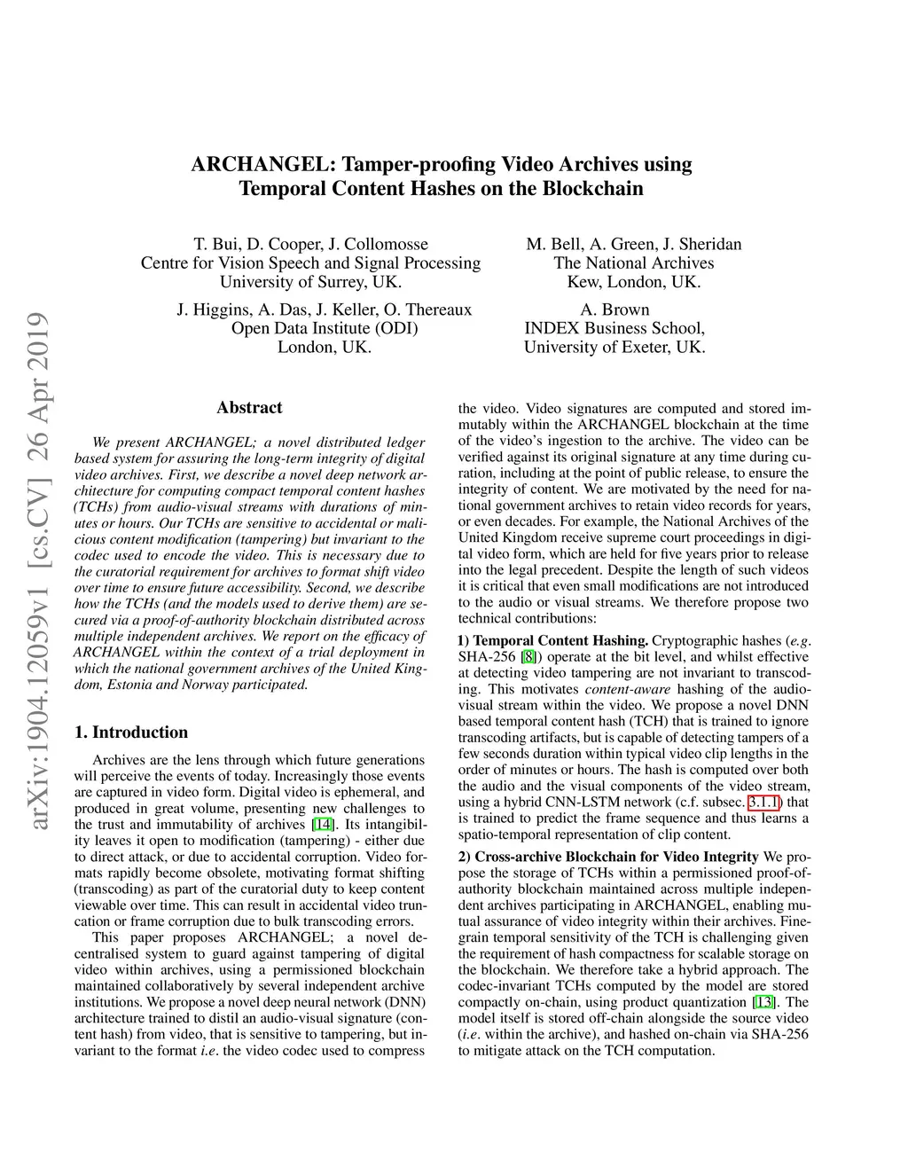 We present ARCHANGEL; a novel distributed ledger based system for assuring the long-term integrity of digital video archives. First, we describe a novel deep network architecture for computing compact temporal content hashes (TCHs) from audio-visual streams with durations of minutes or hours. Our TCHs are sensitive to accidental or malicious content modification (tampering) but invariant to the codec used to encode the video. This is necessary due to the curatorial requirement for archives to format shift video over time to ensure future accessibility. Second, we describe how the TCHs (and the models used to derive them) are secured via a proof-of-authority blockchain distributed across multiple independent archives. We report on the efficacy of ARCHANGEL within the context of a trial deployment in which the national government archives of the United Kingdom, Estonia and Norway participated.