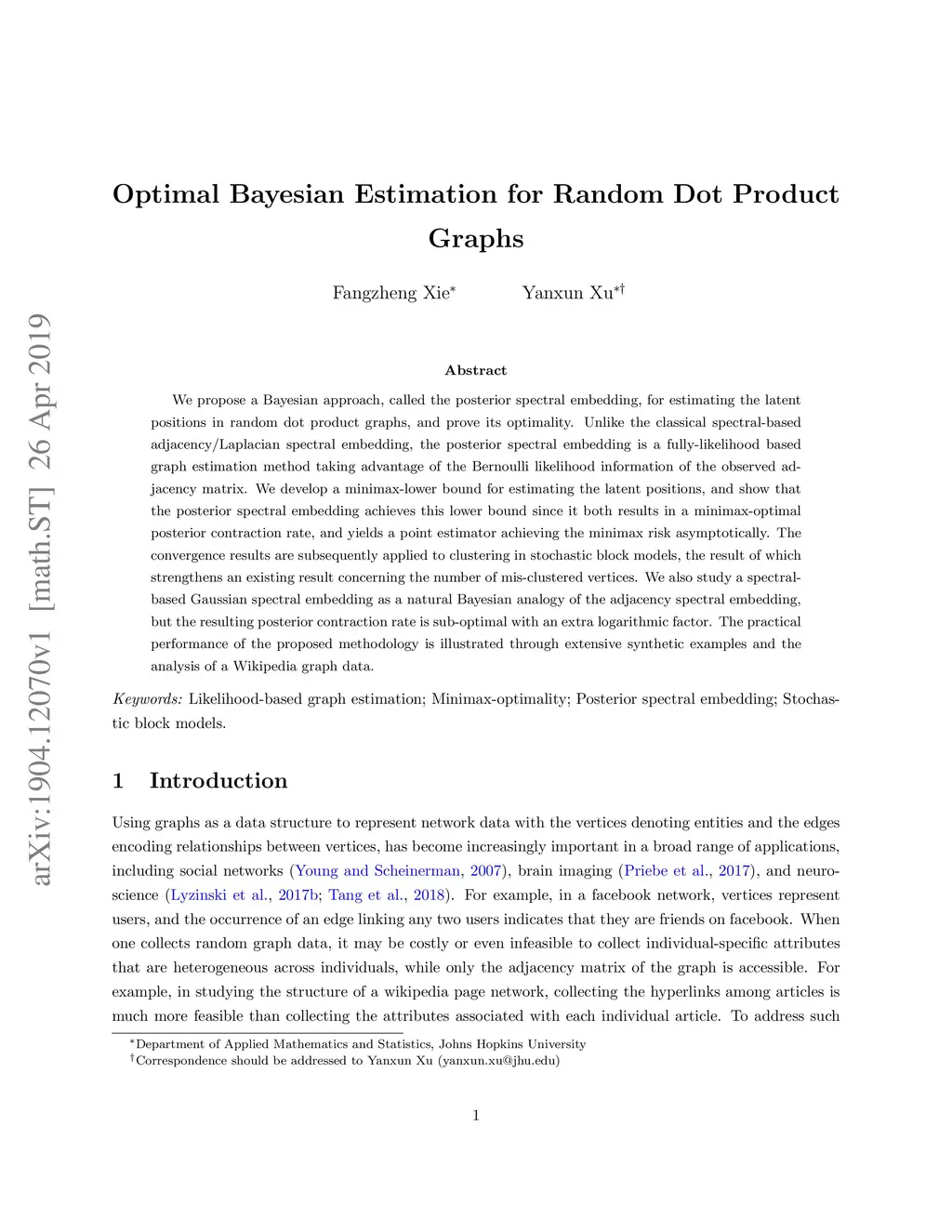 We propose a Bayesian approach, called the posterior spectral embedding, for estimating the latent positions in random dot product graphs, and prove its optimality. Unlike the classical spectral-based adjacency/Laplacian spectral embedding, the posterior spectral embedding is a fully-likelihood based graph estimation method taking advantage of the Bernoulli likelihood information of the observed adjacency matrix. We develop a minimax-lower bound for estimating the latent positions, and show that the posterior spectral embedding achieves this lower bound since it both results in a minimax-optimal posterior contraction rate, and yields a point estimator achieving the minimax risk asymptotically. The convergence results are subsequently applied to clustering in stochastic block models, the result of which strengthens an existing result concerning the number of mis-clustered vertices. We also study a spectral-based Gaussian spectral embedding as a natural Bayesian analogy of the adjacency spectral embedding, but the resulting posterior contraction rate is sub-optimal with an extra logarithmic factor. The practical performance of the proposed methodology is illustrated through extensive synthetic examples and the analysis of a Wikipedia graph data.