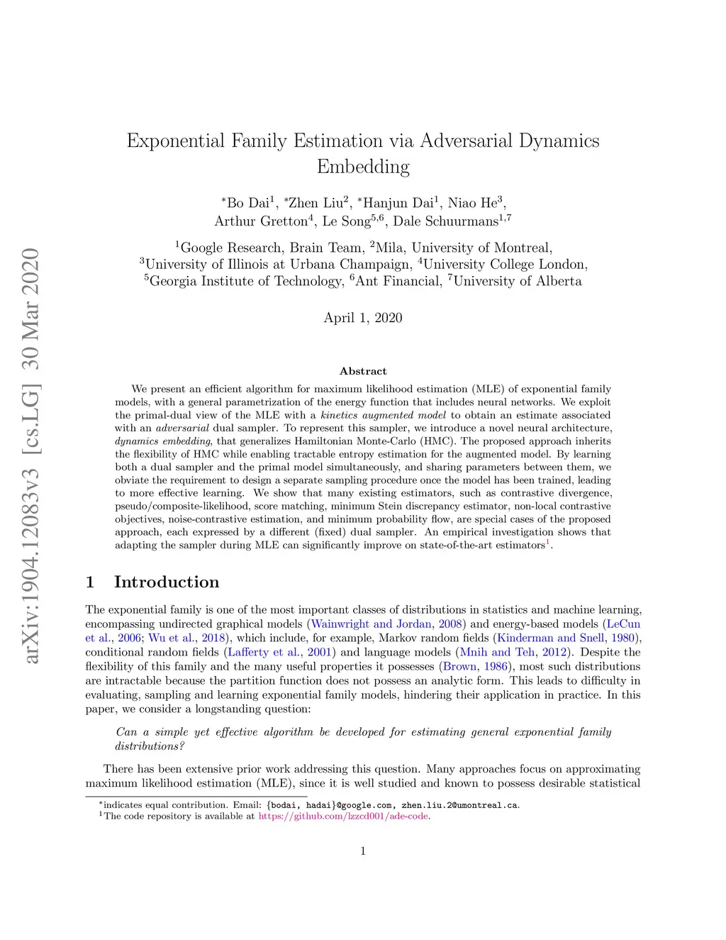 Exponential Family Estimation via Adversarial Dynamics Embedding