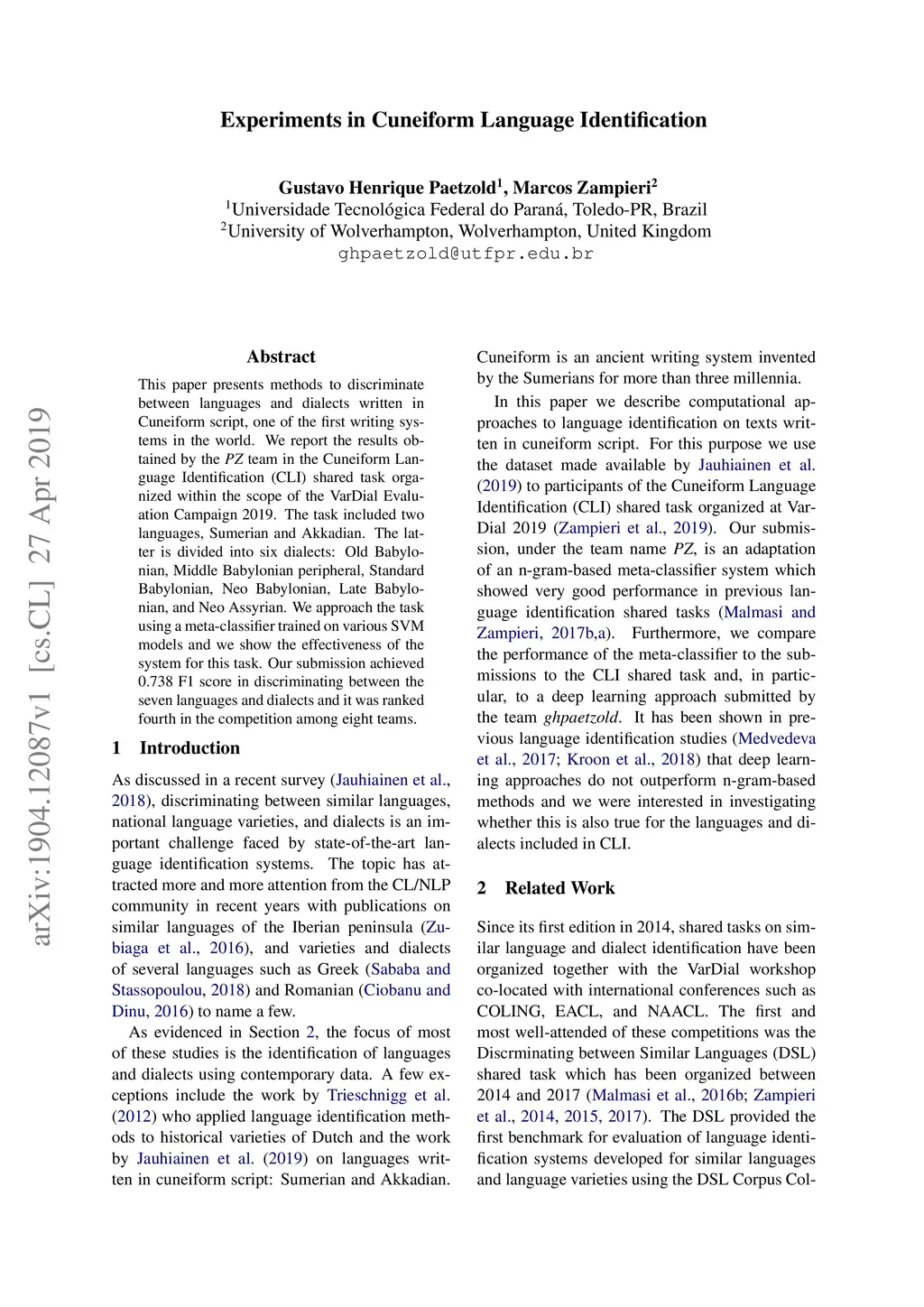 Experiments in Cuneiform Language Identification