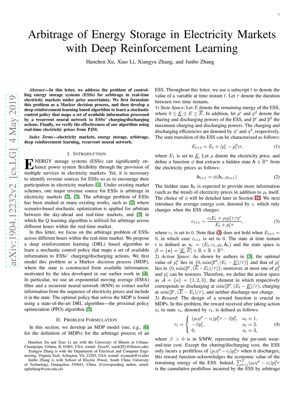 In this letter, we address the problem of controlling energy storage systems (ESSs) for arbitrage in real-time electricity markets under price uncertainty. We first formulate this problem as a Markov decision process, and then develop a deep reinforcement learning based algorithm to learn a stochastic control policy that maps a set of available information processed by a recurrent neural network to ESSs' charging/discharging actions. Finally, we verify the effectiveness of our algorithm using real-time electricity prices from PJM.