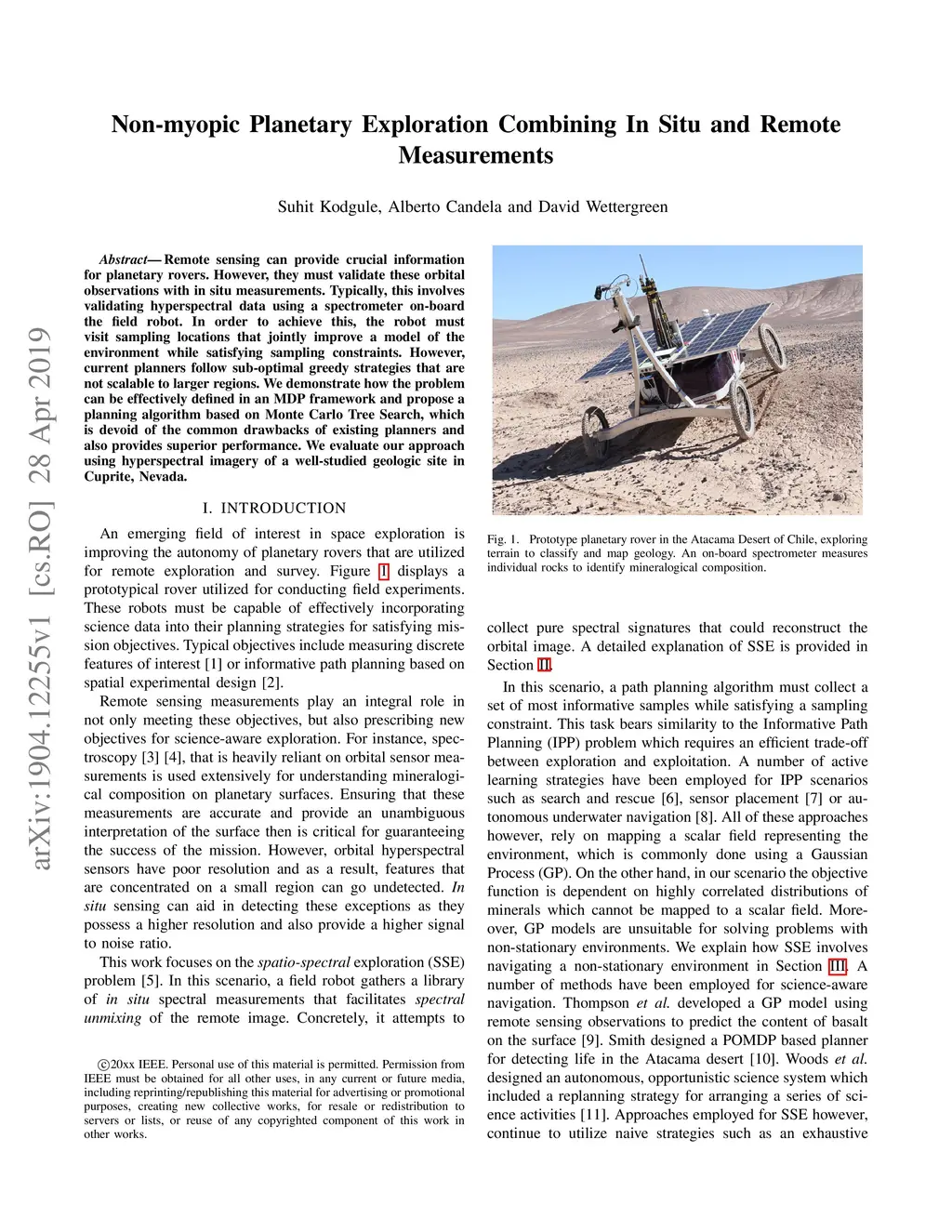 Remote sensing can provide crucial information for planetary rovers. However, they must validate these orbital observations with in situ measurements. Typically, this involves validating hyperspectral data using a spectrometer on-board the field robot. In order to achieve this, the robot must visit sampling locations that jointly improve a model of the environment while satisfying sampling constraints. However, current planners follow sub-optimal greedy strategies that are not scalable to larger regions. We demonstrate how the problem can be effectively defined in an MDP framework and propose a planning algorithm based on Monte Carlo Tree Search, which is devoid of the common drawbacks of existing planners and also provides superior performance. We evaluate our approach using hyperspectral imagery of a well-studied geologic site in Cuprite, Nevada.
