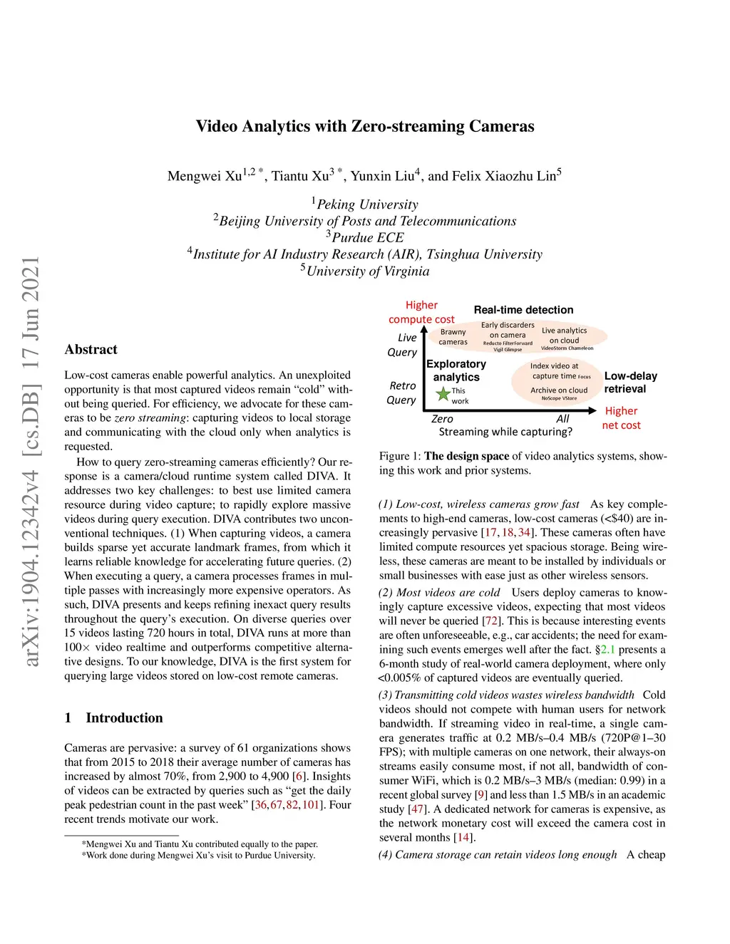 Low-cost cameras enable powerful analytics. An unexploited opportunity is that most captured videos remain "cold" without being queried. For efficiency, we advocate for these cameras to be zero streaming: capturing videos to local storage and communicating with the cloud only when analytics is requested. How to query zero-streaming cameras efficiently? Our response is a camera/cloud runtime system called DIVA. It addresses two key challenges: to best use limited camera resource during video capture; to rapidly explore massive videos during query execution. DIVA contributes two unconventional techniques. (1) When capturing videos, a camera builds sparse yet accurate landmark frames, from which it learns reliable knowledge for accelerating future queries. (2) When executing a query, a camera processes frames in multiple passes with increasingly more expensive operators. As such, DIVA presents and keeps refining inexact query results throughout the query's execution. On diverse queries over 15 videos lasting 720 hours in total, DIVA runs at more than 100x video realtime and outperforms competitive alternative designs. To our knowledge, DIVA is the first system for querying large videos stored on low-cost remote cameras.