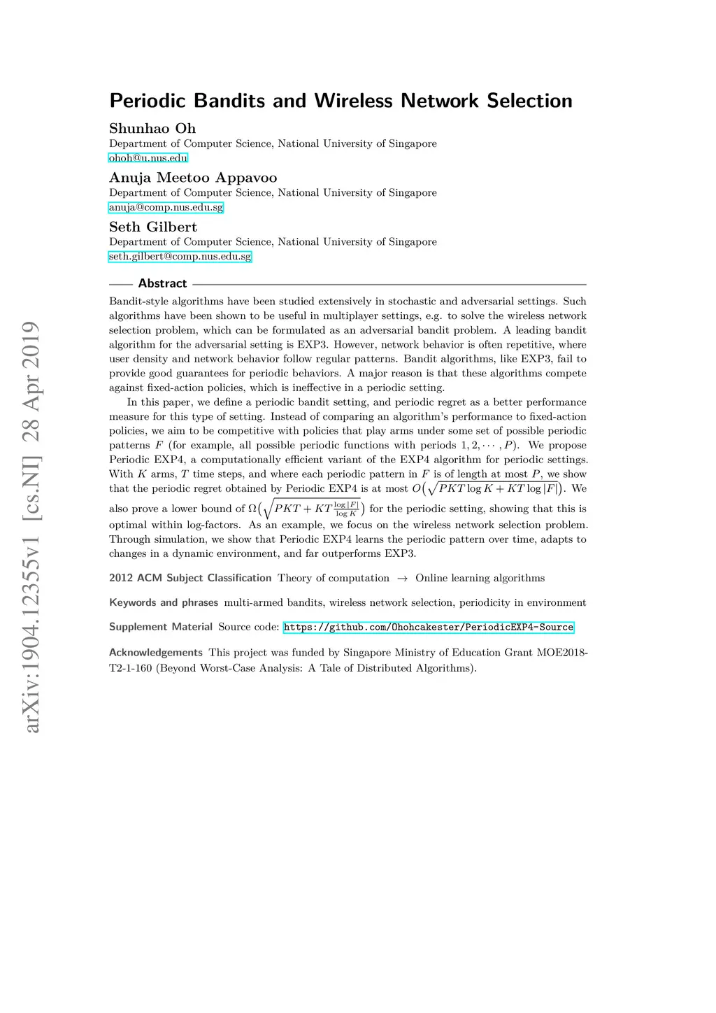 Bandit-style algorithms have been studied extensively in stochastic and adversarial settings. Such algorithms have been shown to be useful in multiplayer settings, e.g. to solve the wireless network selection problem, which can be formulated as an adversarial bandit problem. A leading bandit algorithm for the adversarial setting is EXP3. However, network behavior is often repetitive, where user density and network behavior follow regular patterns. Bandit algorithms, like EXP3, fail to provide good guarantees for periodic behaviors. A major reason is that these algorithms compete against fixed-action policies, which is ineffective in a periodic setting. In this paper, we define a periodic bandit setting, and periodic regret as a better performance measure for this type of setting. Instead of comparing an algorithm's performance to fixed-action policies, we aim to be competitive with policies that play arms under some set of possible periodic patterns (for example, all possible periodic functions with periods ). We propose Periodic EXP4, a computationally efficient variant of the EXP4 algorithm for periodic settings. With arms, time steps, and where each periodic pattern in is of length at most , we show that the periodic regret obtained by Periodic EXP4 is at most . We also prove a lower bound of for the periodic setting, showing that this is optimal within log-factors. As an example, we focus on the wireless network selection problem. Through simulation, we show that Periodic EXP4 learns the periodic pattern over time, adapts to changes in a dynamic environment, and far outperforms EXP3.
