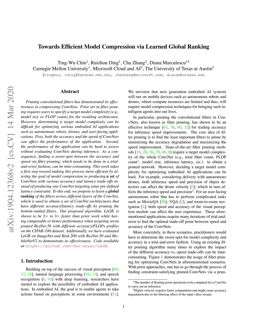 Pruning convolutional filters has demonstrated its effectiveness in compressing ConvNets. Prior art in filter pruning requires users to specify a target model complexity (e.g., model size or FLOP count) for the resulting architecture. However, determining a target model complexity can be difficult for optimizing various embodied AI applications such as autonomous robots, drones, and user-facing applications. First, both the accuracy and the speed of ConvNets can affect the performance of the application. Second, the performance of the application can be hard to assess without evaluating ConvNets during inference. As a consequence, finding a sweet-spot between the accuracy and speed via filter pruning, which needs to be done in a trial-and-error fashion, can be time-consuming. This work takes a first step toward making this process more efficient by altering the goal of model compression to producing a set of ConvNets with various accuracy and latency trade-offs instead of producing one ConvNet targeting some pre-defined latency constraint. To this end, we propose to learn a global ranking of the filters across different layers of the ConvNet, which is used to obtain a set of ConvNet architectures that have different accuracy/latency trade-offs by pruning the bottom-ranked filters. Our proposed algorithm, LeGR, is shown to be 2x to 3x faster than prior work while having comparable or better performance when targeting seven pruned ResNet-56 with different accuracy/FLOPs profiles on the CIFAR-100 dataset. Additionally, we have evaluated LeGR on ImageNet and Bird-200 with ResNet-50 and MobileNetV2 to demonstrate its effectiveness. Code available at https://github.com/cmu-enyac/LeGR.