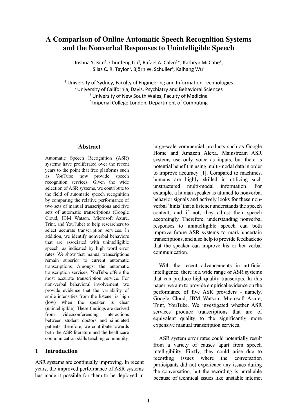 Automatic Speech Recognition (ASR) systems have proliferated over the recent years to the point that free platforms such as YouTube now provide speech recognition services. Given the wide selection of ASR systems, we contribute to the field of automatic speech recognition by comparing the relative performance of two sets of manual transcriptions and five sets of automatic transcriptions (Google Cloud, IBM Watson, Microsoft Azure, Trint, and YouTube) to help researchers to select accurate transcription services. In addition, we identify nonverbal behaviors that are associated with unintelligible speech, as indicated by high word error rates. We show that manual transcriptions remain superior to current automatic transcriptions. Amongst the automatic transcription services, YouTube offers the most accurate transcription service. For non-verbal behavioral involvement, we provide evidence that the variability of smile intensities from the listener is high (low) when the speaker is clear (unintelligible). These findings are derived from videoconferencing interactions between student doctors and simulated patients; therefore, we contribute towards both the ASR literature and the healthcare communication skills teaching community.