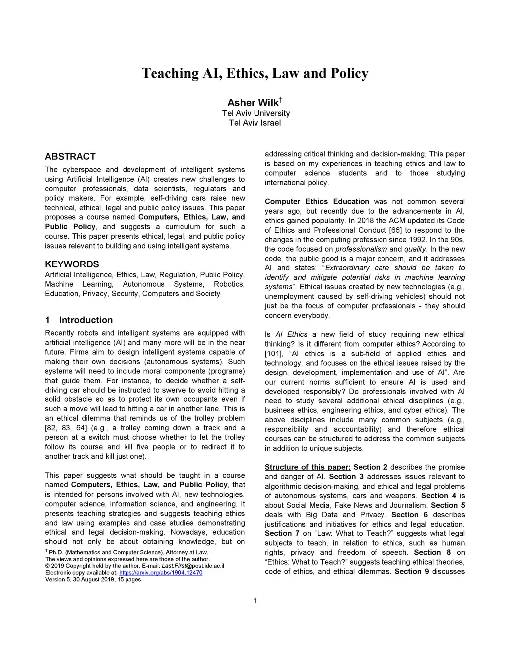 Teaching AI, Ethics, Law and Policy
