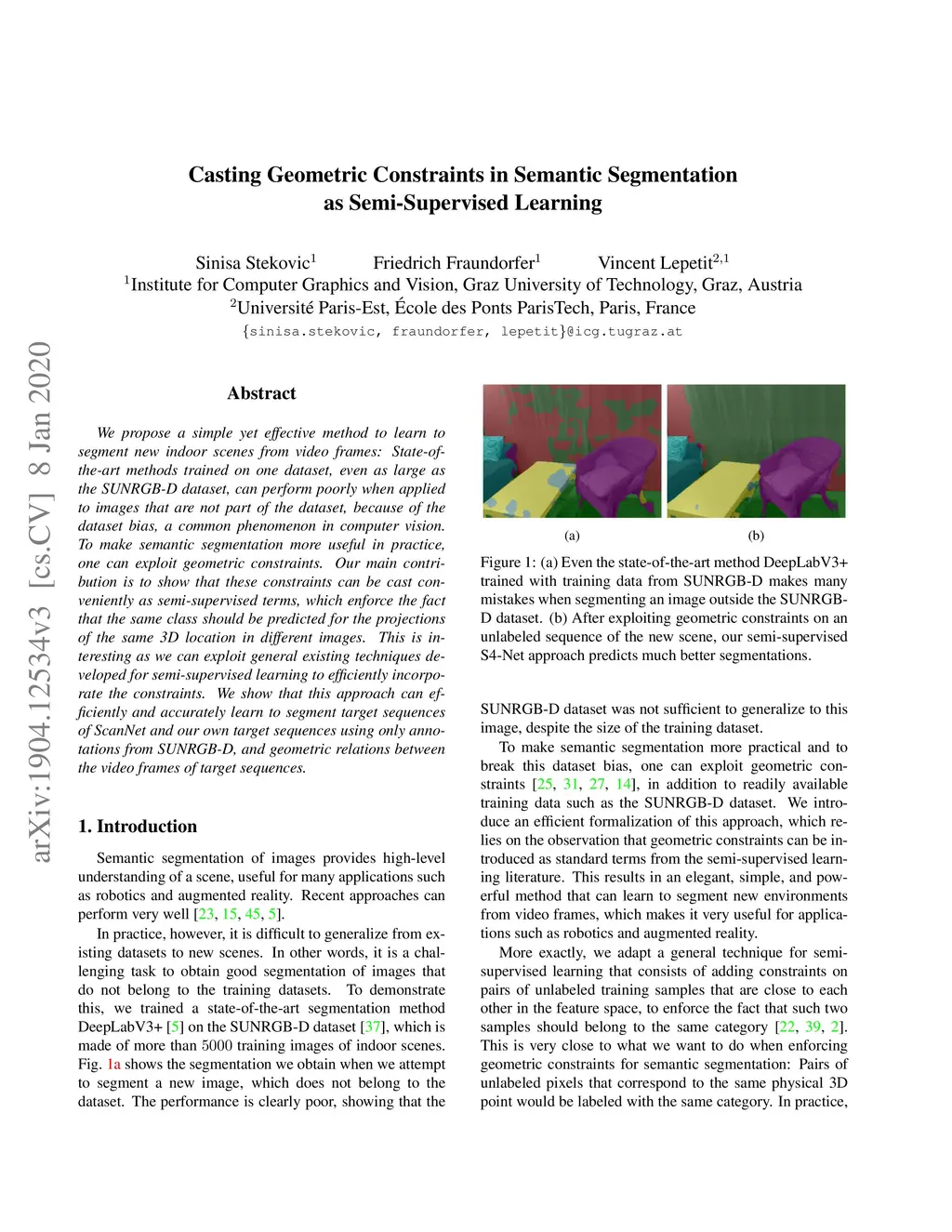 We propose a simple yet effective method to learn to segment new indoor scenes from video frames: State-of-the-art methods trained on one dataset, even as large as the SUNRGB-D dataset, can perform poorly when applied to images that are not part of the dataset, because of the dataset bias, a common phenomenon in computer vision. To make semantic segmentation more useful in practice, one can exploit geometric constraints. Our main contribution is to show that these constraints can be cast conveniently as semi-supervised terms, which enforce the fact that the same class should be predicted for the projections of the same 3D location in different images. This is interesting as we can exploit general existing techniques developed for semi-supervised learning to efficiently incorporate the constraints. We show that this approach can efficiently and accurately learn to segment target sequences of ScanNet and our own target sequences using only annotations from SUNRGB-D, and geometric relations between the video frames of target sequences.