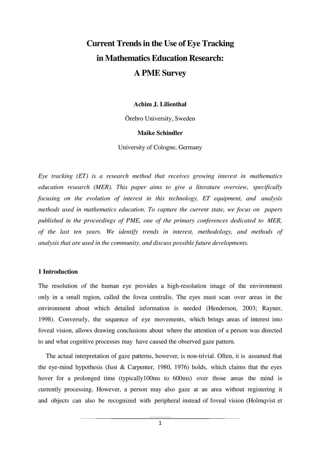 Eye tracking (ET) is a research method that receives growing interest in mathematics education research (MER). This paper aims to give a literature overview, specifically focusing on the evolution of interest in this technology, ET equipment, and analysis methods used in mathematics education. To capture the current state, we focus on papers published in the proceedings of PME, one of the primary conferences dedicated to MER, of the last ten years. We identify trends in interest, methodology, and methods of analysis that are used in the community, and discuss possible future developments.