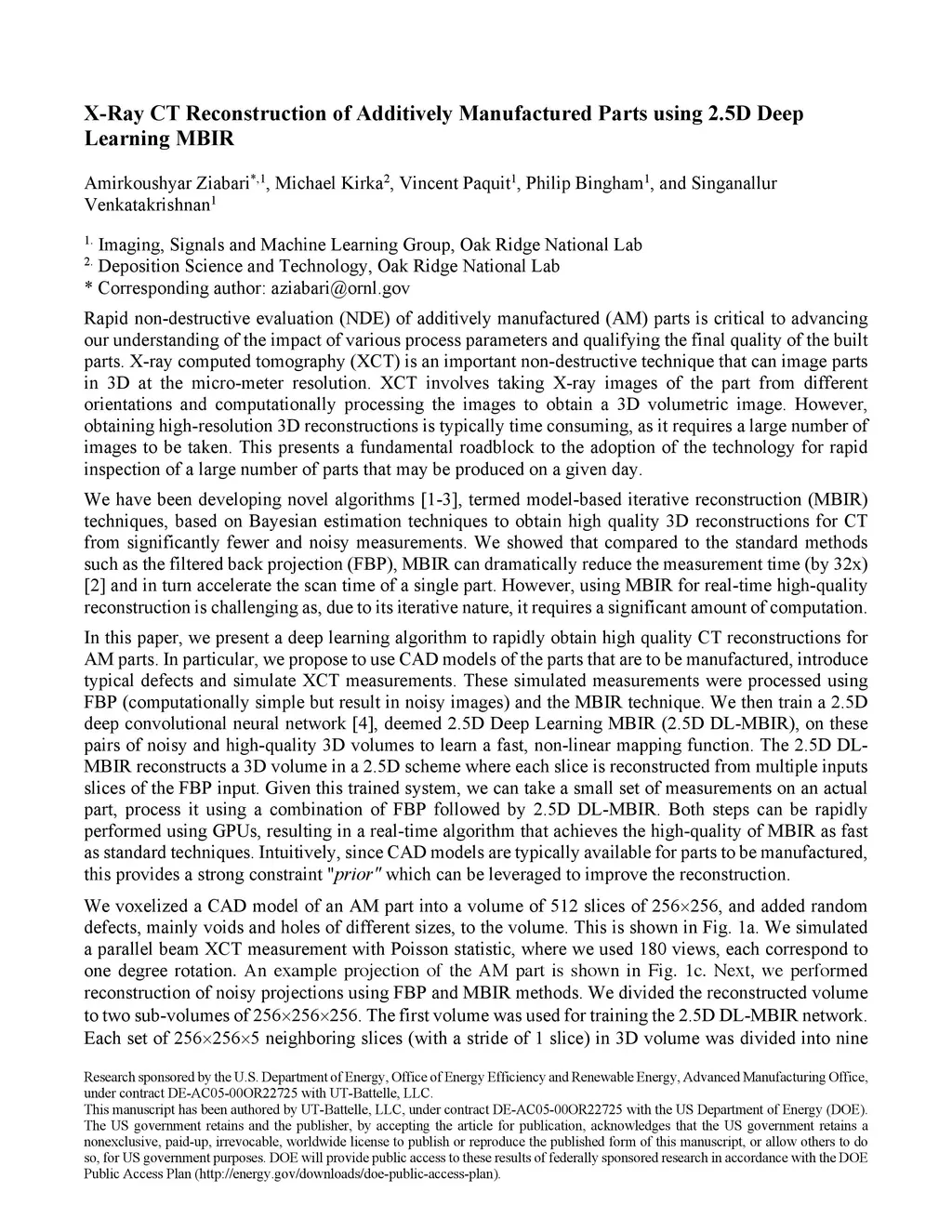 In this paper, we present a deep learning algorithm to rapidly obtain high quality CT reconstructions for AM parts. In particular, we propose to use CAD models of the parts that are to be manufactured, introduce typical defects and simulate XCT measurements. These simulated measurements were processed using FBP (computationally simple but result in noisy images) and the MBIR technique. We then train a 2.5D deep convolutional neural network [4], deemed 2.5D Deep Learning MBIR (2.5D DL-MBIR), on these pairs of noisy and high-quality 3D volumes to learn a fast, non-linear mapping function. The 2.5D DL-MBIR reconstructs a 3D volume in a 2.5D scheme where each slice is reconstructed from multiple inputs slices of the FBP input. Given this trained system, we can take a small set of measurements on an actual part, process it using a combination of FBP followed by 2.5D DL-MBIR. Both steps can be rapidly performed using GPUs, resulting in a real-time algorithm that achieves the high-quality of MBIR as fast as standard techniques. Intuitively, since CAD models are typically available for parts to be manufactured, this provides a strong constraint "prior" which can be leveraged to improve the reconstruction.