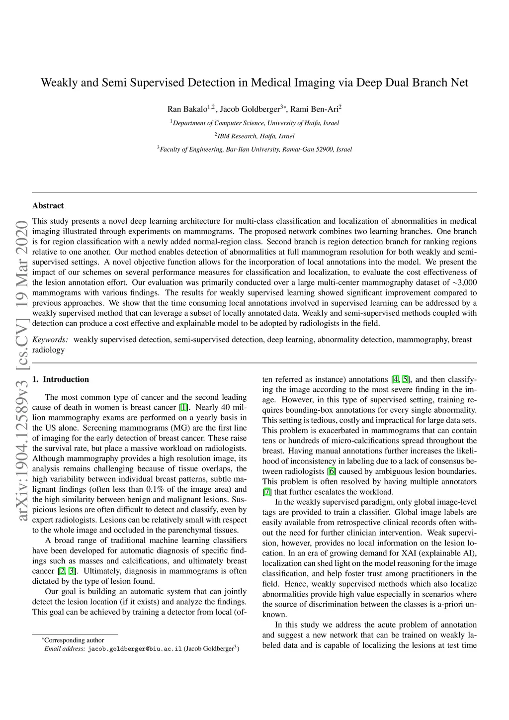 Objective: This paper suggests a novel deep learning architecture for multi-class classification and localization of abnormalities in mammograms. We first assume a weakly supervised setting and present a new approach with data driven decisions. Next, we extend this method to a semi-supervised setting that engages a small set of local annotations. Methods: This novel network combines two learning branches with region-level classification and region ranking, explicitly handling the common normal images without any finding. Our method enables detection of abnormalities in full mammogram resolution for both weakly and semi-supervised settings. A novel objective function allows engagement of local annotations into the model. Results: We present the impact of our schemes with several performance measures for classification and localization, to evaluate the cost effectiveness of lesion annotation effort. Our evaluation is mainly made over a large multi-center mammography dataset of 3,000 mammograms with various findings. The results for weakly supervised learning show improvement of 4% in AUC, 10-17% in partial AUC (AUC at high sensitivity) and 8-15% in specificity at 0.85 sensitivity, compared to a previous approach. Local annotation of only 5% of the mammograms further boosts performance by 8.2% in specificity and 30% in detection. Conclusion: Lack of laborious local annotations for supervised learning can be addressed by a weakly supervised method that can leverage a subset of locally annotated data. Significance: Weakly and semi-supervised methods coupled with detection suggest a cost effective and explainable model to be adopted by radiologists in the field.