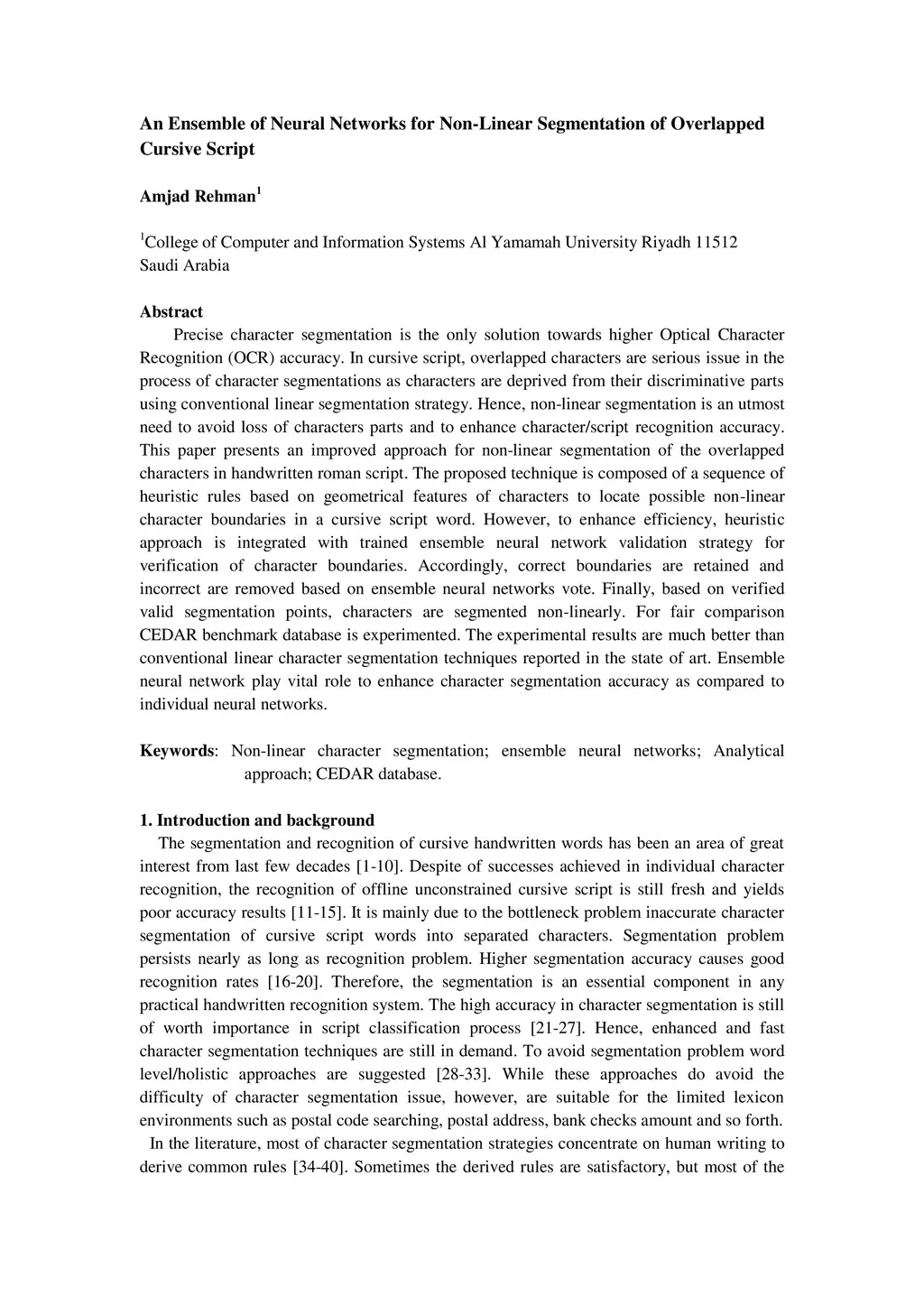 Precise character segmentation is the only solution towards higher Optical Character Recognition (OCR) accuracy. In cursive script, overlapped characters are serious issue in the process of character segmentations as characters are deprived from their discriminative parts using conventional linear segmentation strategy. Hence, non-linear segmentation is an utmost need to avoid loss of characters parts and to enhance character/script recognition accuracy. This paper presents an improved approach for non-linear segmentation of the overlapped characters in handwritten roman script. The proposed technique is composed of a sequence of heuristic rules based on geometrical features of characters to locate possible non-linear character boundaries in a cursive script word. However, to enhance efficiency, heuristic approach is integrated with trained ensemble neural network validation strategy for verification of character boundaries. Accordingly, correct boundaries are retained and incorrect are removed based on ensemble neural networks vote. Finally, based on verified valid segmentation points, characters are segmented non-linearly. For fair comparison CEDAR benchmark database is experimented. The experimental results are much better than conventional linear character segmentation techniques reported in the state of art. Ensemble neural network play vital role to enhance character segmentation accuracy as compared to individual neural networks.