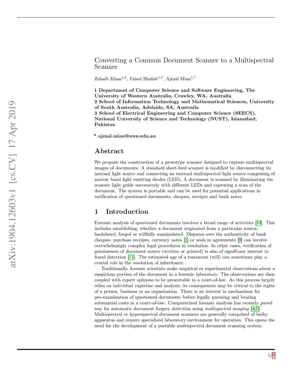 We propose the construction of a prototype scanner designed to capture multispectral images of documents. A standard sheet-feed scanner is modified by disconnecting its internal light source and connecting an external multispectral light source comprising of narrow band light emitting diodes (LED). A document is scanned by illuminating the scanner light guide successively with different LEDs and capturing a scan of the document. The system is portable and can be used for potential applications in verification of questioned documents, cheques, receipts and bank notes.