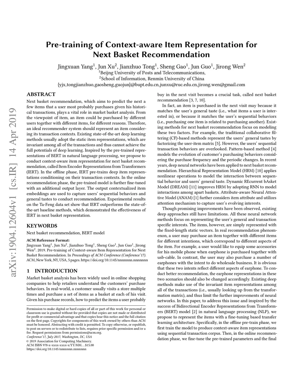 Next basket recommendation, which aims to predict the next a few items that a user most probably purchases given his historical transactions, plays a vital role in market basket analysis. From the viewpoint of item, an item could be purchased by different users together with different items, for different reasons. Therefore, an ideal recommender system should represent an item considering its transaction contexts. Existing state-of-the-art deep learning methods usually adopt the static item representations, which are invariant among all of the transactions and thus cannot achieve the full potentials of deep learning. Inspired by the pre-trained representations of BERT in natural language processing, we propose to conduct context-aware item representation for next basket recommendation, called Item Encoder Representations from Transformers (IERT). In the offline phase, IERT pre-trains deep item representations conditioning on their transaction contexts. In the online recommendation phase, the pre-trained model is further fine-tuned with an additional output layer. The output contextualized item embeddings are used to capture users' sequential behaviors and general tastes to conduct recommendation. Experimental results on the Ta-Feng data set show that IERT outperforms the state-of-the-art baseline methods, which demonstrated the effectiveness of IERT in next basket representation.