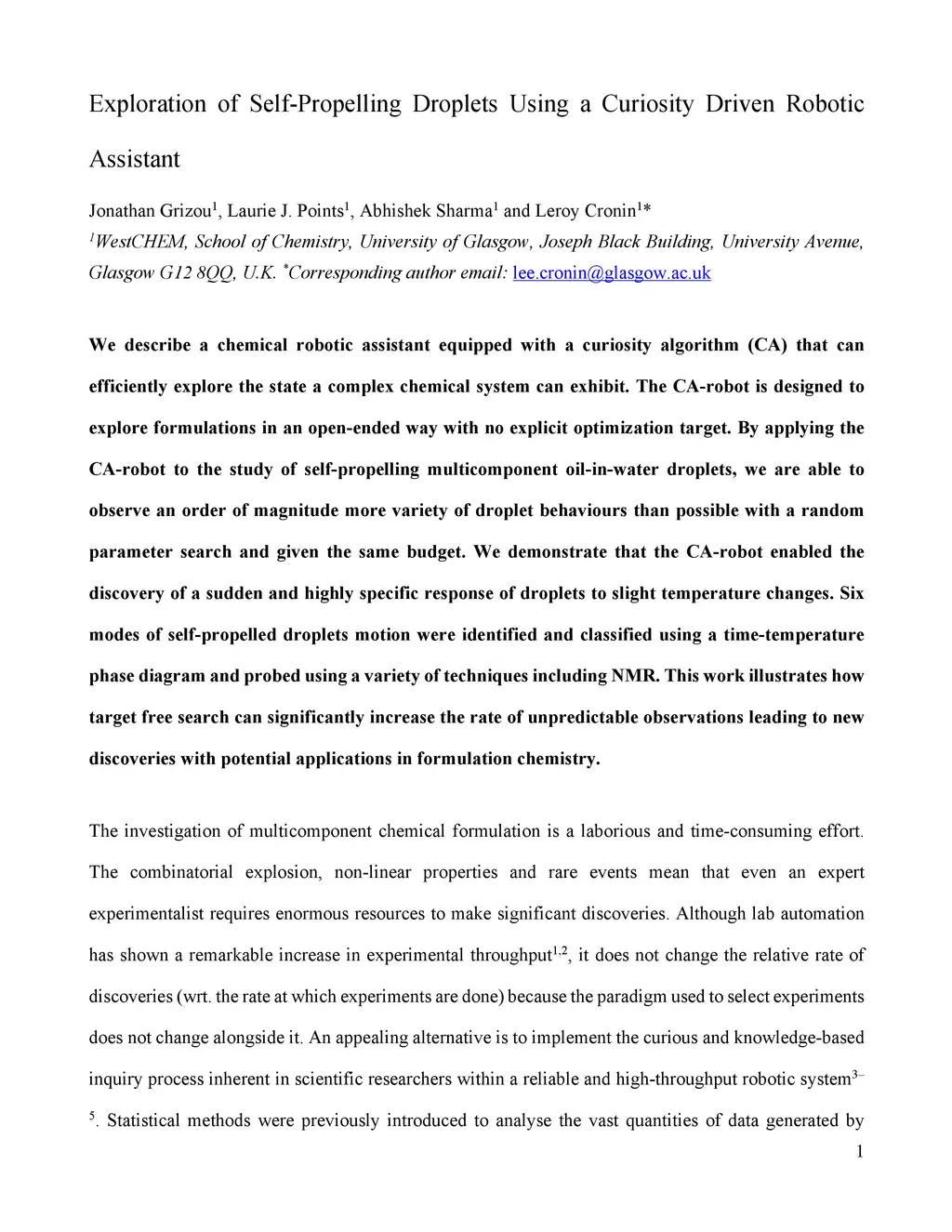 We describe a chemical robotic assistant equipped with a curiosity algorithm (CA) that can efficiently explore the state a complex chemical system can exhibit. The CA-robot is designed to explore formulations in an open-ended way with no explicit optimization target. By applying the CA-robot to the study of self-propelling multicomponent oil-in-water droplets, we are able to observe an order of magnitude more variety of droplet behaviours than possible with a random parameter search and given the same budget. We demonstrate that the CA-robot enabled the discovery of a sudden and highly specific response of droplets to slight temperature changes. Six modes of self-propelled droplets motion were identified and classified using a time-temperature phase diagram and probed using a variety of techniques including NMR. This work illustrates how target free search can significantly increase the rate of unpredictable observations leading to new discoveries with potential applications in formulation chemistry.