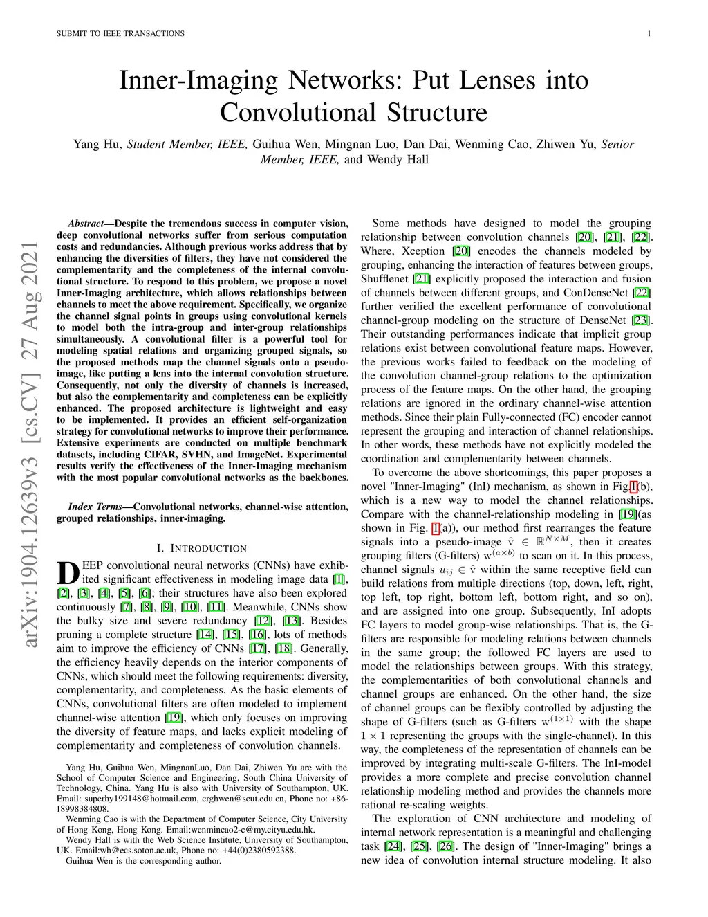Despite the tremendous success in computer vision, deep convolutional networks suffer from serious computation costs and redundancies. Although previous works address this issue by enhancing diversities of filters, they have not considered the complementarity and the completeness of the internal structure of the convolutional network. To deal with these problems, a novel Inner-Imaging architecture is proposed in this paper, which allows relationships between channels to meet the above requirement. Specifically, we organize the channel signal points in groups using convolutional kernels to model both the intra-group and inter-group relationships simultaneously. The convolutional filter is a powerful tool for modeling spatial relations and organizing grouped signals, so the proposed methods map the channel signals onto a pseudo-image, like putting a lens into convolution internal structure. Consequently, not only the diversity of channels is increased, but also the complementarity and completeness can be explicitly enhanced. The proposed architecture is lightweight and easy to be implemented. It provides an efficient self-organization strategy for convolutional networks so as to improve their efficiency and performance. Extensive experiments are conducted on multiple benchmark image recognition data sets including CIFAR, SVHN and ImageNet. Experimental results verify the effectiveness of the Inner-Imaging mechanism with the most popular convolutional networks as the backbones.