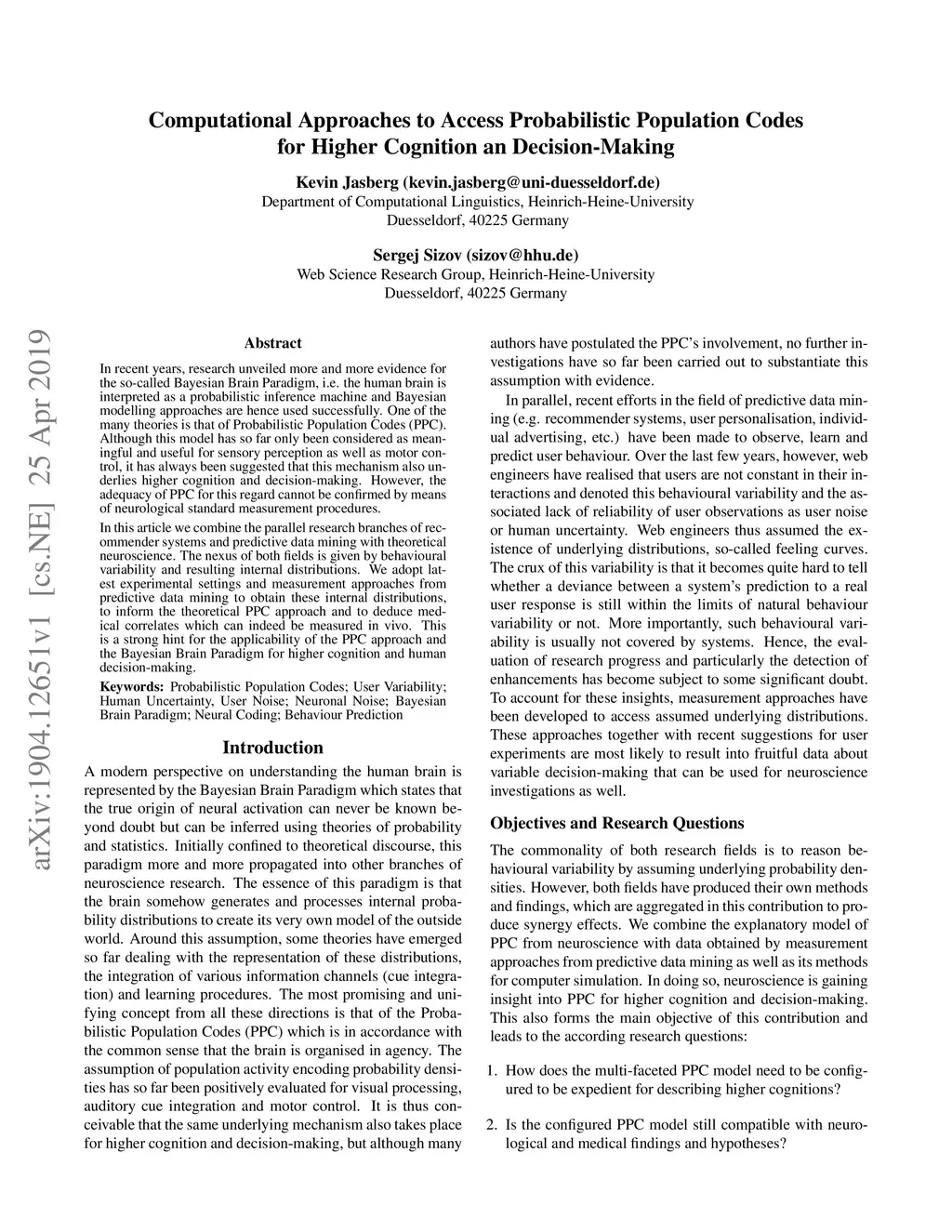 In recent years, research unveiled more and more evidence for the so-called Bayesian Brain Paradigm, i.e. the human brain is interpreted as a probabilistic inference machine and Bayesian modelling approaches are hence used successfully. One of the many theories is that of Probabilistic Population Codes (PPC). Although this model has so far only been considered as meaningful and useful for sensory perception as well as motor control, it has always been suggested that this mechanism also underlies higher cognition and decision-making. However, the adequacy of PPC for this regard cannot be confirmed by means of neurological standard measurement procedures. In this article we combine the parallel research branches of recommender systems and predictive data mining with theoretical neuroscience. The nexus of both fields is given by behavioural variability and resulting internal distributions. We adopt latest experimental settings and measurement approaches from predictive data mining to obtain these internal distributions, to inform the theoretical PPC approach and to deduce medical correlates which can indeed be measured in vivo. This is a strong hint for the applicability of the PPC approach and the Bayesian Brain Paradigm for higher cognition and human decision-making.