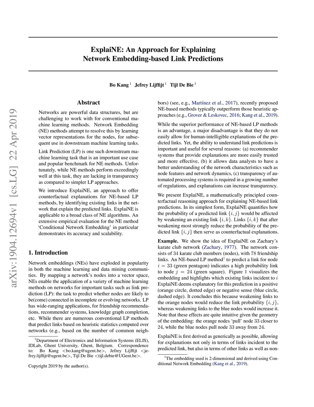 Networks are powerful data structures, but are challenging to work with for conventional machine learning methods. Network Embedding (NE) methods attempt to resolve this by learning vector representations for the nodes, for subsequent use in downstream machine learning tasks. Link Prediction (LP) is one such downstream machine learning task that is an important use case and popular benchmark for NE methods. Unfortunately, while NE methods perform exceedingly well at this task, they are lacking in transparency as compared to simpler LP approaches. We introduce ExplaiNE, an approach to offer counterfactual explanations for NE-based LP methods, by identifying existing links in the network that explain the predicted links. ExplaiNE is applicable to a broad class of NE algorithms. An extensive empirical evaluation for the NE method `Conditional Network Embedding' in particular demonstrates its accuracy and scalability.