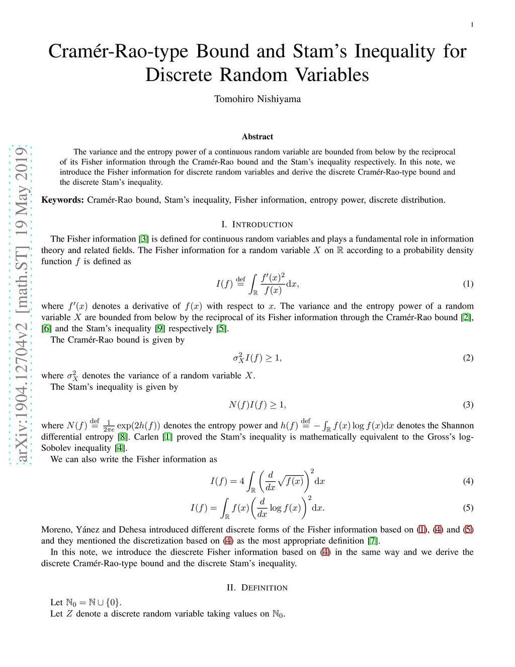 The variance and the entropy power of a continuous random variable are bounded from below by the reciprocal of its Fisher information through the Cram\'{e}r-Rao bound and the Stam's inequality respectively. In this note, we introduce the Fisher information for discrete random variables and derive the discrete Cram\'{e}r-Rao-type bound and the discrete Stam's inequality.