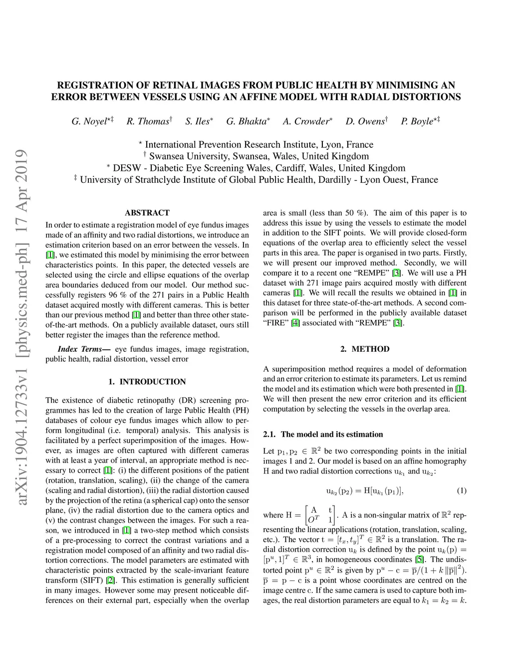 In order to estimate a registration model of eye fundus images made of an affinity and two radial distortions, we introduce an estimation criterion based on an error between the vessels. In [1], we estimated this model by minimising the error between characteristics points. In this paper, the detected vessels are selected using the circle and ellipse equations of the overlap area boundaries deduced from our model. Our method successfully registers 96 % of the 271 pairs in a Public Health dataset acquired mostly with different cameras. This is better than our previous method [1] and better than three other state-of-the-art methods. On a publicly available dataset, ours still better register the images than the reference method.