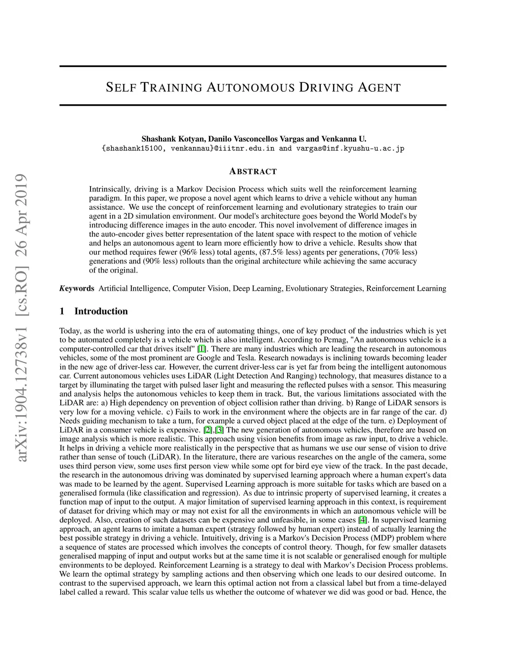 Intrinsically, driving is a Markov Decision Process which suits well the reinforcement learning paradigm. In this paper, we propose a novel agent which learns to drive a vehicle without any human assistance. We use the concept of reinforcement learning and evolutionary strategies to train our agent in a 2D simulation environment. Our model's architecture goes beyond the World Model's by introducing difference images in the auto encoder. This novel involvement of difference images in the auto-encoder gives better representation of the latent space with respect to the motion of vehicle and helps an autonomous agent to learn more efficiently how to drive a vehicle. Results show that our method requires fewer (96% less) total agents, (87.5% less) agents per generations, (70% less) generations and (90% less) rollouts than the original architecture while achieving the same accuracy of the original.