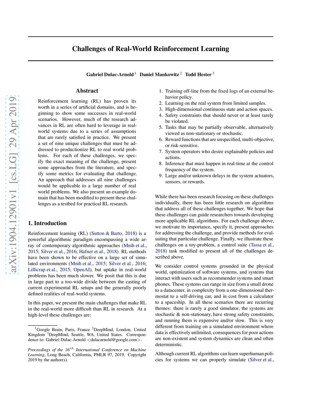 Reinforcement learning (RL) has proven its worth in a series of artificial domains, and is beginning to show some successes in real-world scenarios. However, much of the research advances in RL are often hard to leverage in real-world systems due to a series of assumptions that are rarely satisfied in practice. We present a set of nine unique challenges that must be addressed to productionize RL to real world problems. For each of these challenges, we specify the exact meaning of the challenge, present some approaches from the literature, and specify some metrics for evaluating that challenge. An approach that addresses all nine challenges would be applicable to a large number of real world problems. We also present an example domain that has been modified to present these challenges as a testbed for practical RL research.