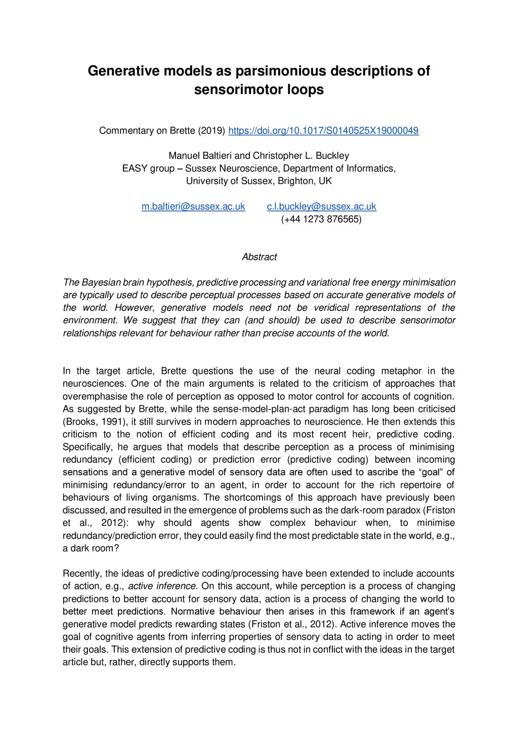 The Bayesian brain hypothesis, predictive processing and variational free energy minimisation are typically used to describe perceptual processes based on accurate generative models of the world. However, generative models need not be veridical representations of the environment. We suggest that they can (and should) be used to describe sensorimotor relationships relevant for behaviour rather than precise accounts of the world.