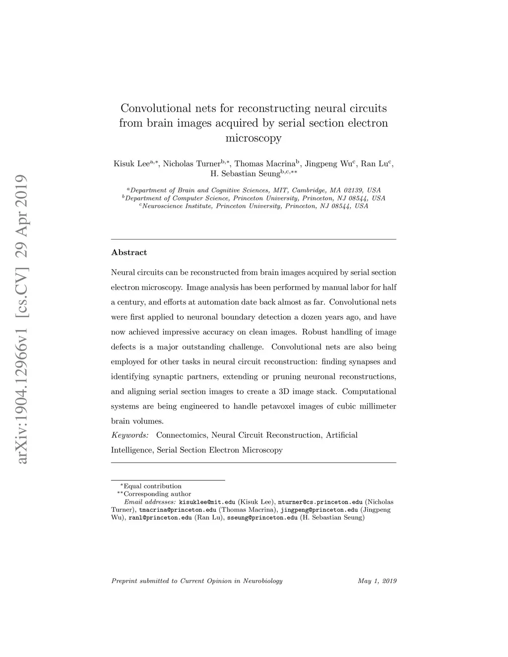 Neural circuits can be reconstructed from brain images acquired by serial section electron microscopy. Image analysis has been performed by manual labor for half a century, and efforts at automation date back almost as far. Convolutional nets were first applied to neuronal boundary detection a dozen years ago, and have now achieved impressive accuracy on clean images. Robust handling of image defects is a major outstanding challenge. Convolutional nets are also being employed for other tasks in neural circuit reconstruction: finding synapses and identifying synaptic partners, extending or pruning neuronal reconstructions, and aligning serial section images to create a 3D image stack. Computational systems are being engineered to handle petavoxel images of cubic millimeter brain volumes.