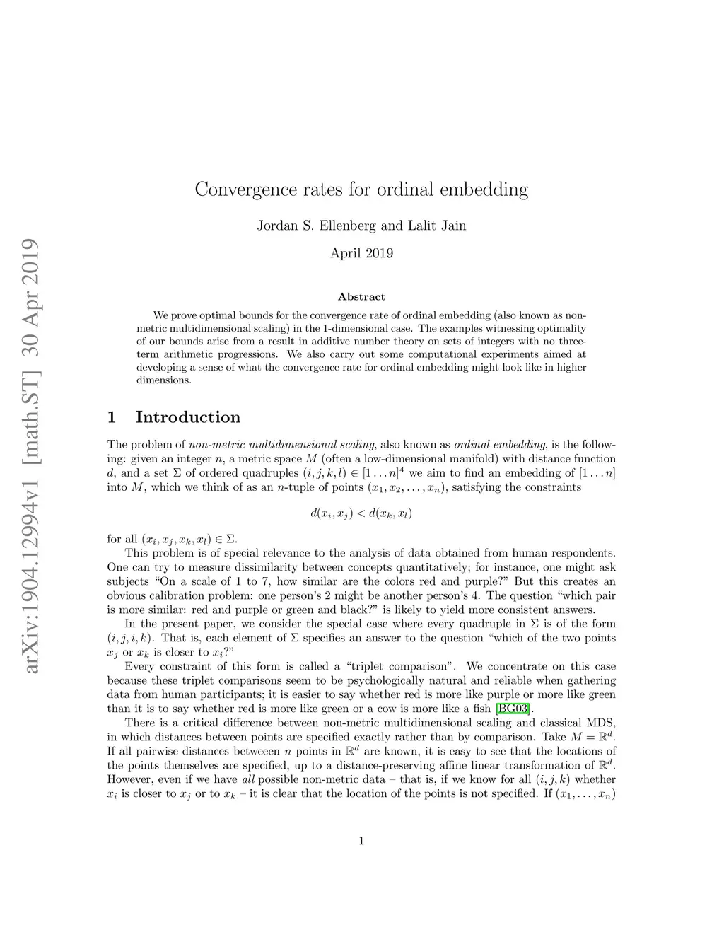 We prove optimal bounds for the convergence rate of ordinal embedding (also known as non-metric multidimensional scaling) in the 1-dimensional case. The examples witnessing optimality of our bounds arise from a result in additive number theory on sets of integers with no three-term arithmetic progressions. We also carry out some computational experiments aimed at developing a sense of what the convergence rate for ordinal embedding might look like in higher dimensions.