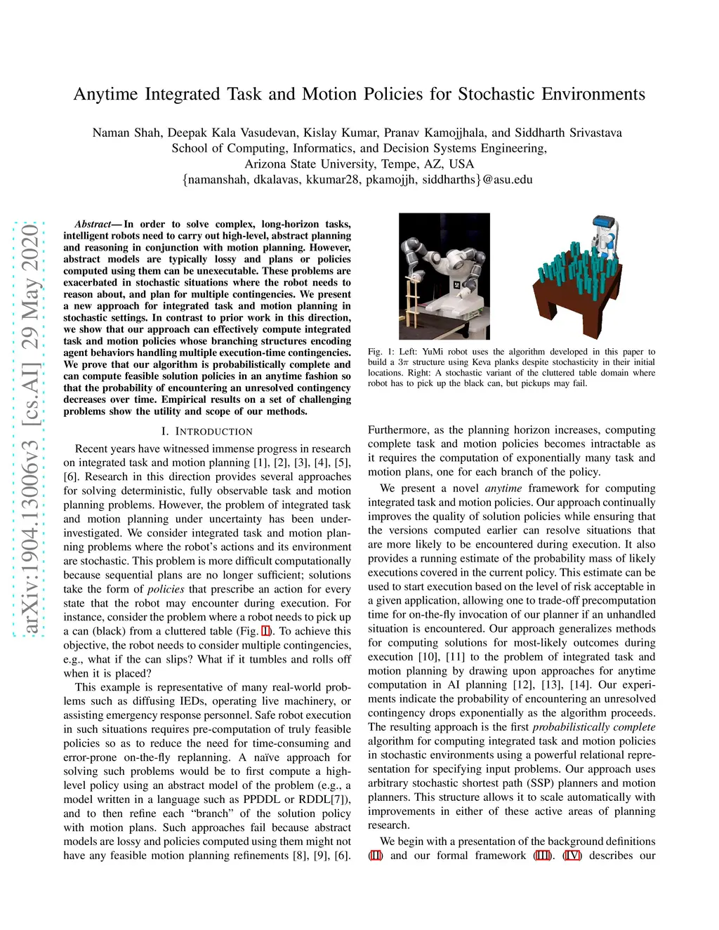 Anytime Integrated Task and Motion Policies for Stochastic Environments