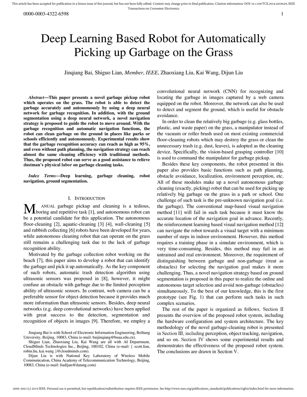 Deep Learning Based Robot for Automatically Picking up Garbage on the