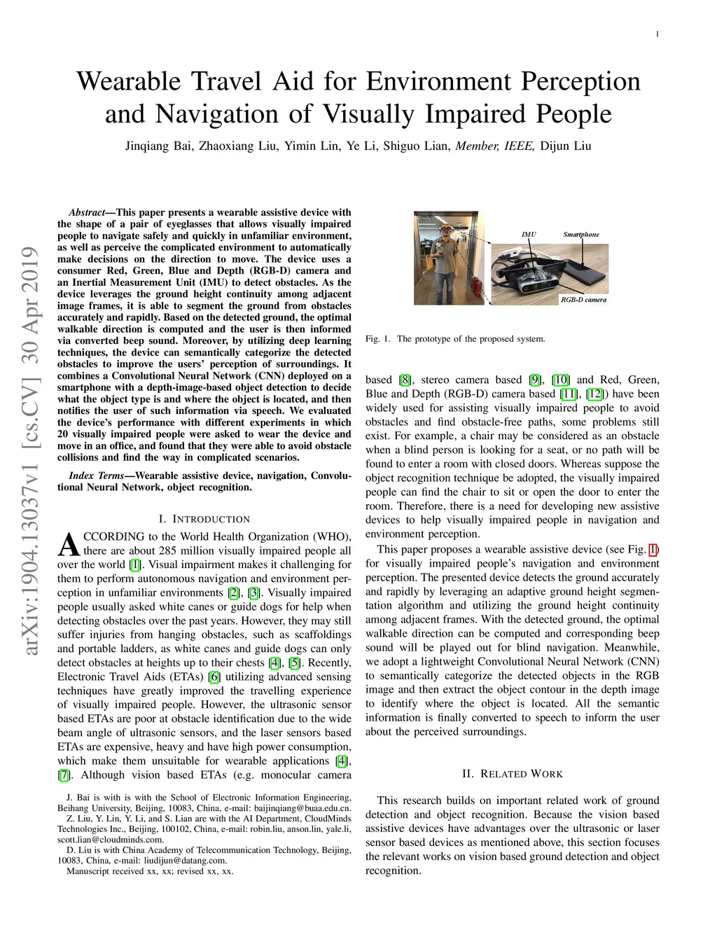 This paper presents a wearable assistive device with the shape of a pair of eyeglasses that allows visually impaired people to navigate safely and quickly in unfamiliar environment, as well as perceive the complicated environment to automatically make decisions on the direction to move. The device uses a consumer Red, Green, Blue and Depth (RGB-D) camera and an Inertial Measurement Unit (IMU) to detect obstacles. As the device leverages the ground height continuity among adjacent image frames, it is able to segment the ground from obstacles accurately and rapidly. Based on the detected ground, the optimal walkable direction is computed and the user is then informed via converted beep sound. Moreover, by utilizing deep learning techniques, the device can semantically categorize the detected obstacles to improve the users' perception of surroundings. It combines a Convolutional Neural Network (CNN) deployed on a smartphone with a depth-image-based object detection to decide what the object type is and where the object is located, and then notifies the user of such information via speech. We evaluated the device's performance with different experiments in which 20 visually impaired people were asked to wear the device and move in an office, and found that they were able to avoid obstacle collisions and find the way in complicated scenarios.