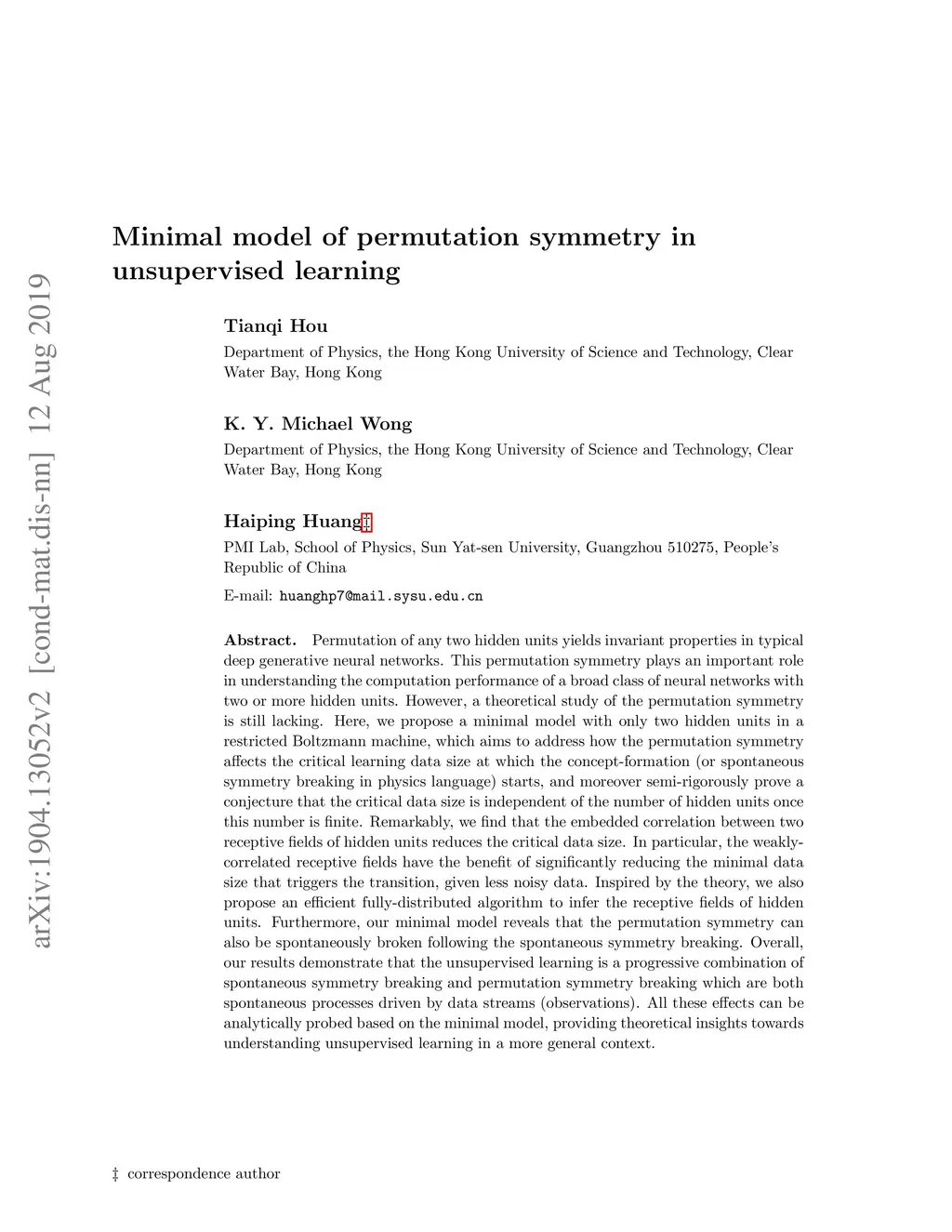 Permutation of any two hidden units yields invariant properties in typical deep generative neural networks. This permutation symmetry plays an important role in understanding the computation performance of a broad class of neural networks with two or more hidden units. However, a theoretical study of the permutation symmetry is still lacking. Here, we propose a minimal model with only two hidden units in a restricted Boltzmann machine, which aims to address how the permutation symmetry affects the critical learning data size at which the concept-formation (or spontaneous symmetry breaking in physics language) starts, and moreover semi-rigorously prove a conjecture that the critical data size is independent of the number of hidden units once this number is finite. Remarkably, we find that the embedded correlation between two receptive fields of hidden units reduces the critical data size. In particular, the weakly-correlated receptive fields have the benefit of significantly reducing the minimal data size that triggers the transition, given less noisy data. Inspired by the theory, we also propose an efficient fully-distributed algorithm to infer the receptive fields of hidden units. Furthermore, our minimal model reveals that the permutation symmetry can also be spontaneously broken following the spontaneous symmetry breaking. Overall, our results demonstrate that the unsupervised learning is a progressive combination of spontaneous symmetry breaking and permutation symmetry breaking which are both spontaneous processes driven by data streams (observations). All these effects can be analytically probed based on the minimal model, providing theoretical insights towards understanding unsupervised learning in a more general context.