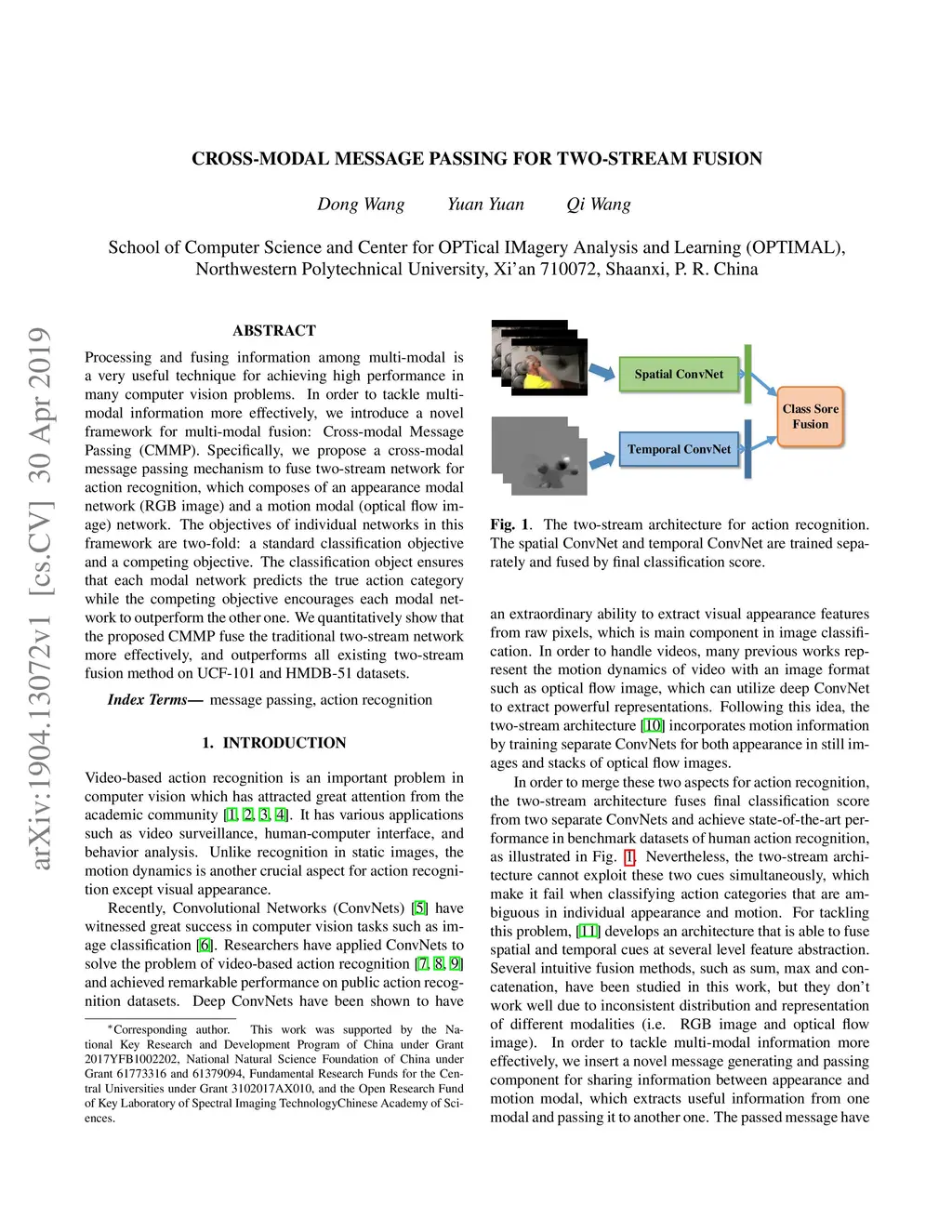 Processing and fusing information among multi-modal is a very useful technique for achieving high performance in many computer vision problems. In order to tackle multi-modal information more effectively, we introduce a novel framework for multi-modal fusion: Cross-modal Message Passing (CMMP). Specifically, we propose a cross-modal message passing mechanism to fuse two-stream network for action recognition, which composes of an appearance modal network (RGB image) and a motion modal (optical flow image) network. The objectives of individual networks in this framework are two-fold: a standard classification objective and a competing objective. The classification object ensures that each modal network predicts the true action category while the competing objective encourages each modal network to outperform the other one. We quantitatively show that the proposed CMMP fuses the traditional two-stream network more effectively, and outperforms all existing two-stream fusion method on UCF-101 and HMDB-51 datasets.