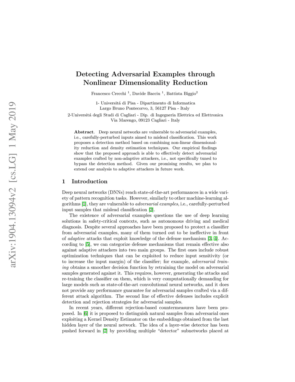Deep neural networks are vulnerable to adversarial examples, i.e., carefully-perturbed inputs aimed to mislead classification. This work proposes a detection method based on combining non-linear dimensionality reduction and density estimation techniques. Our empirical findings show that the proposed approach is able to effectively detect adversarial examples crafted by non-adaptive attackers, i.e., not specifically tuned to bypass the detection method. Given our promising results, we plan to extend our analysis to adaptive attackers in future work.